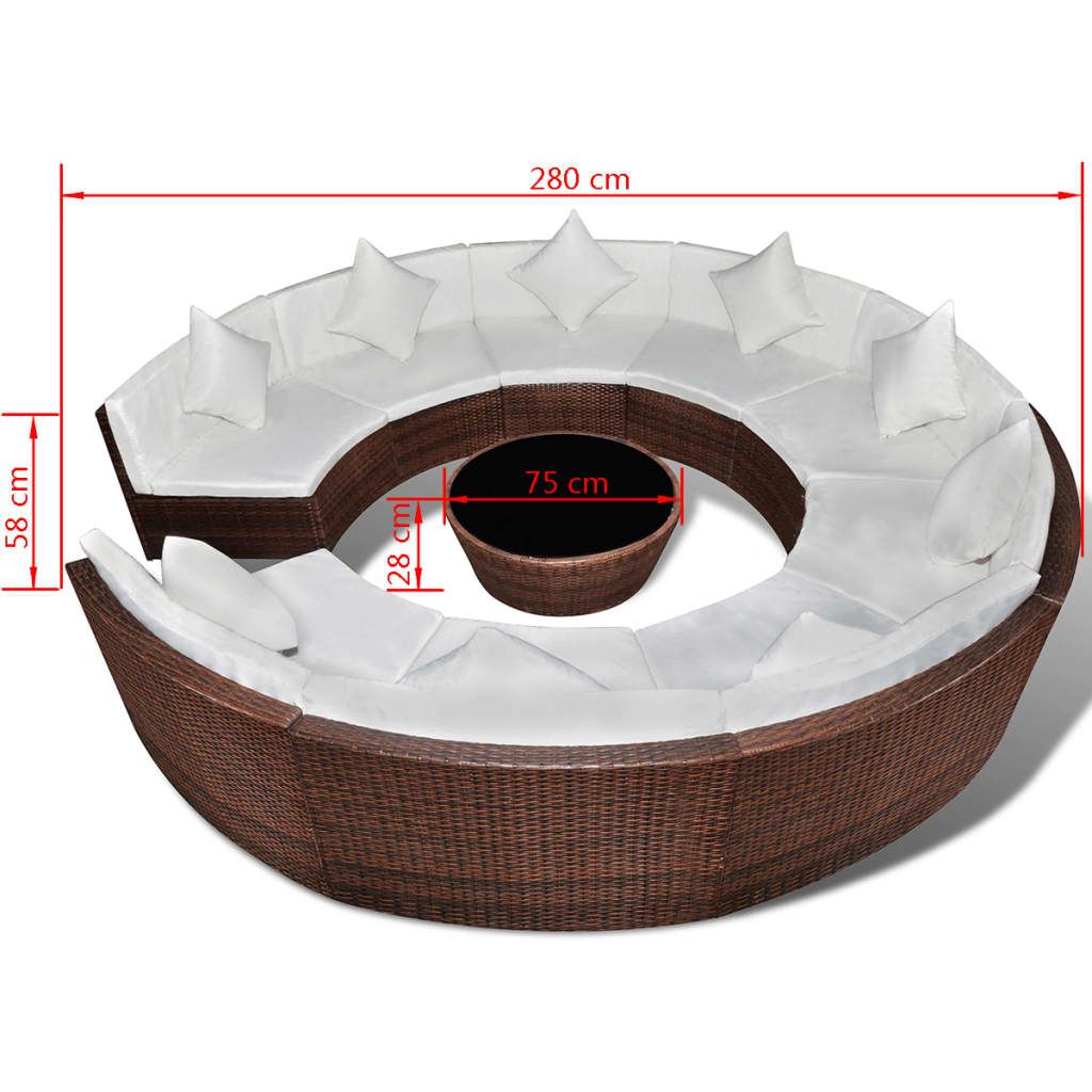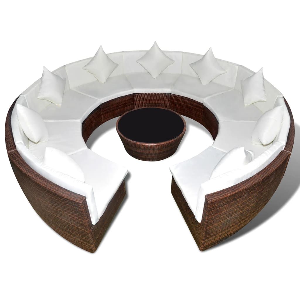 Zaokrąglona, rattanowa sofa łączy jest jednocześnie stylowa oraz funkcjonalna. Z pewnością stanie się centralnym punktem Twojego ogrodu lub patio. Zestaw jest przeznaczony do całorocznego użytkowania na zewnątrz. Dzięki zastosowaniu odpornego na czynniki pogodowe oraz wodę rattanu PE zestaw ten jest łatwy do czyszczenia, wytrzymały i odpowiedni do codziennego użytkowania. Jego mocna, kryta proszkowo, stalowa rama jest niezwykle trwała. Zestaw jest modułowy i lekki, można go więc swobodnie przestawiać i dopasować do dowolnego otoczenia. Zestaw ten jest dostarczany z bardzo wygodnymi, grubo wyściełanymi poduszkami na siedziska i pod plecy. Poszewki na poduszki są zdejmowane i można je prać. Przesyłka zawiera 9-częściową sofę, 1 stolik kawowy, 9 poduszek i 18 poduszek na siedziska. Uwaga: zalecamy przykrycie mebli na czas deszczu, śniegu i mrozu.