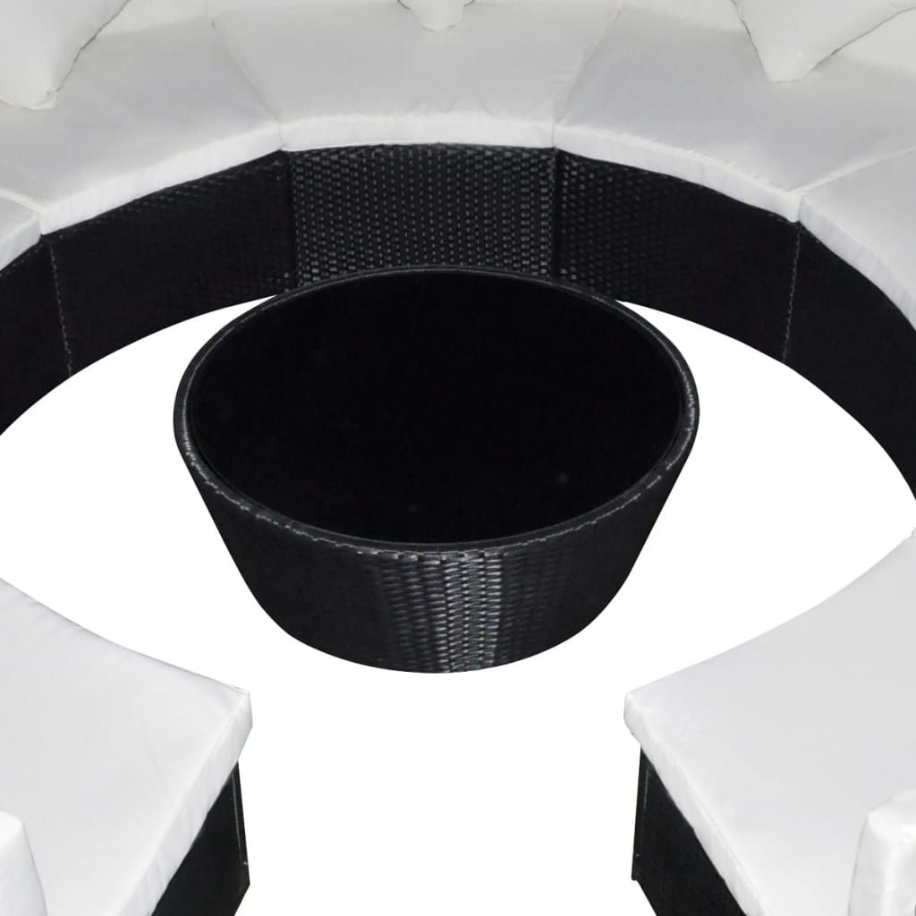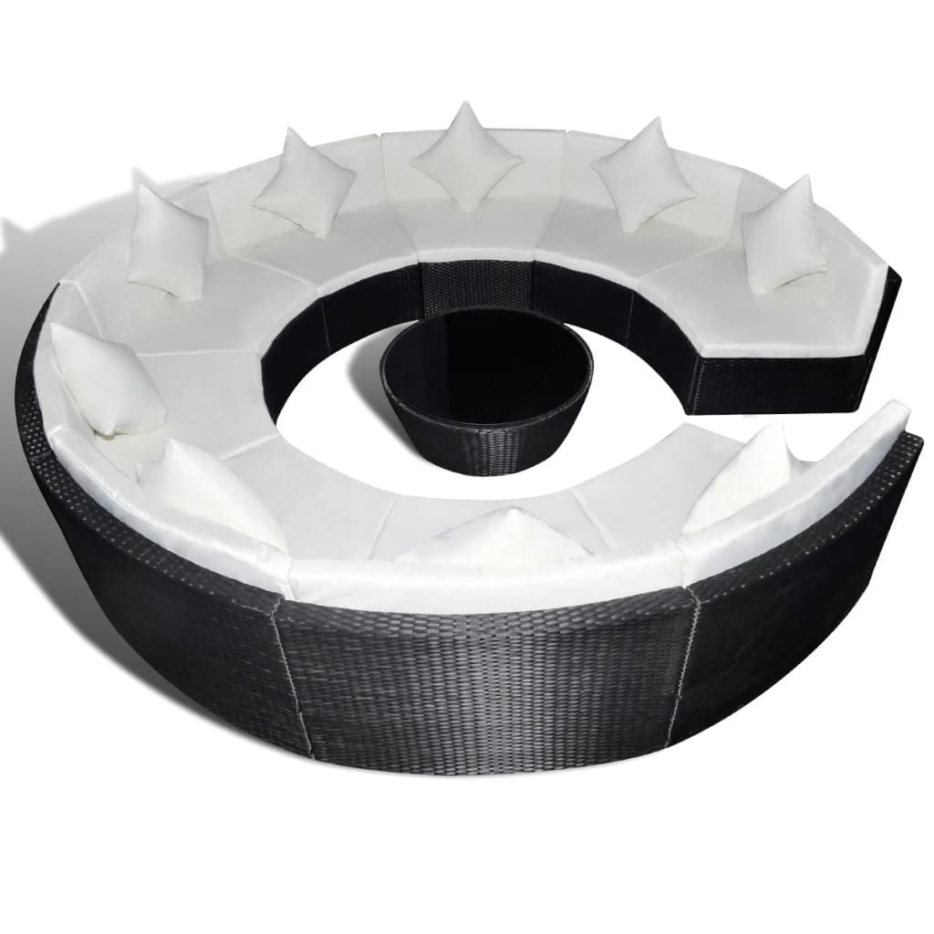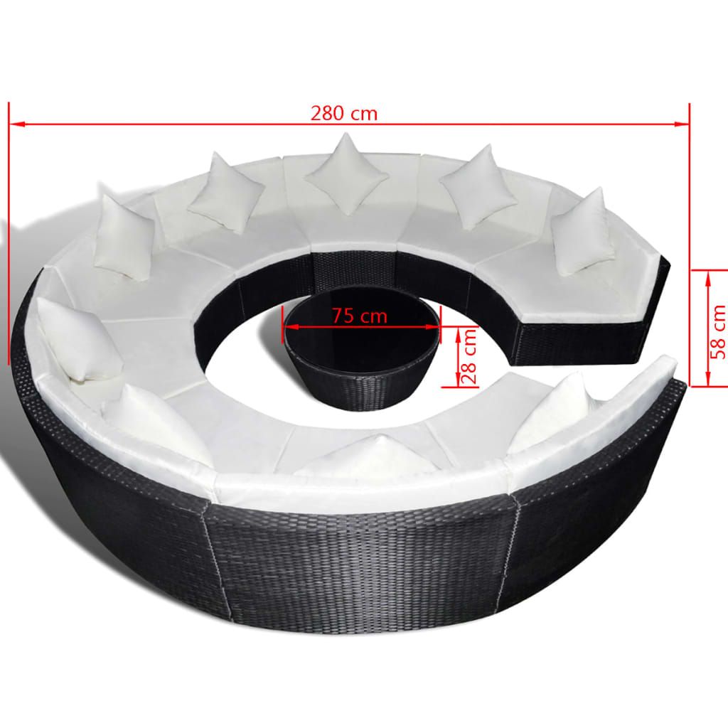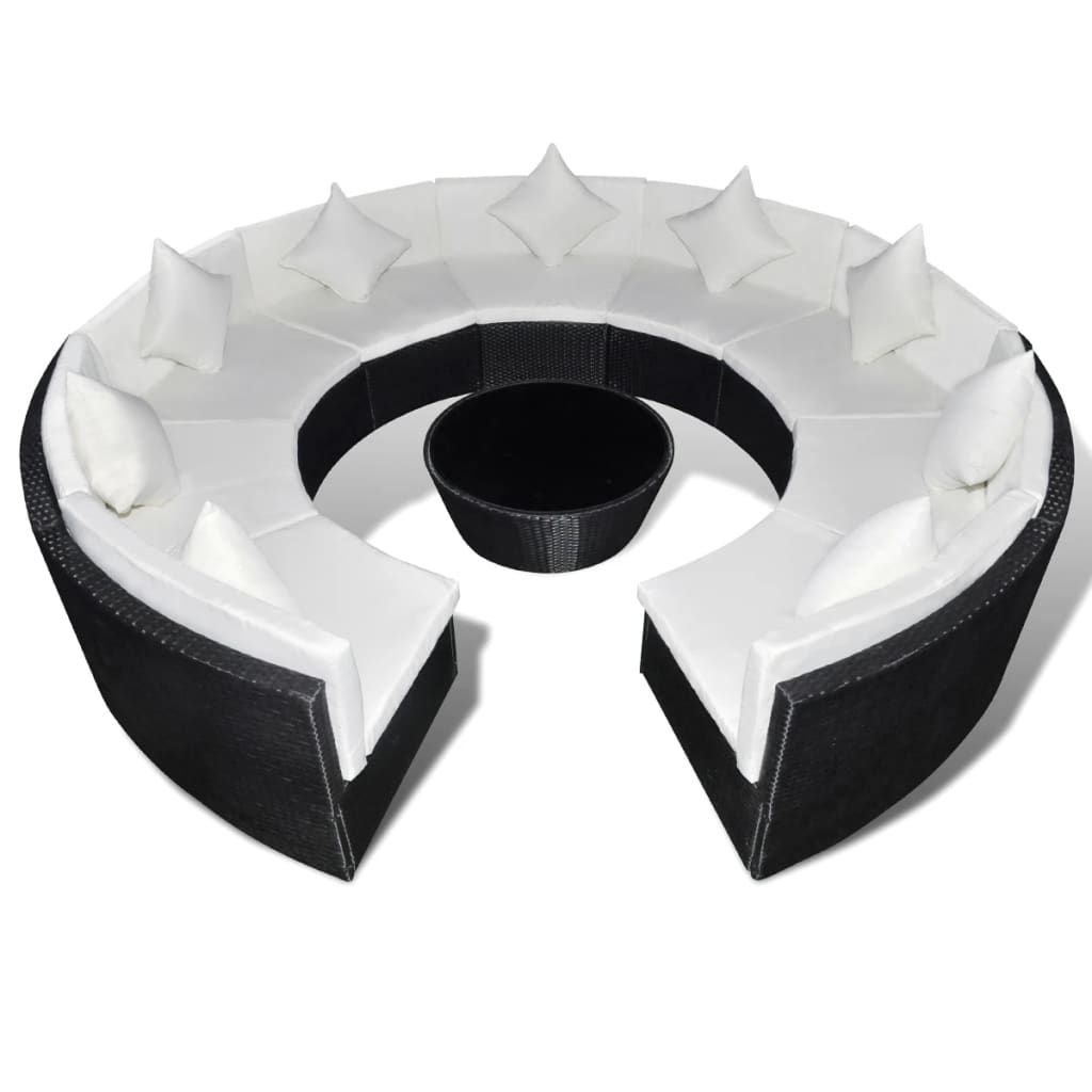 Zaokrąglona, rattanowa sofa łączy jest jednocześnie stylowa oraz funkcjonalna. Z pewnością stanie się centralnym punktem Twojego ogrodu lub patio. Zestaw jest przeznaczony do całorocznego użytkowania na zewnątrz. Dzięki zastosowaniu odpornego na czynniki pogodowe oraz wodę rattanu PE zestaw ten jest łatwy do czyszczenia, wytrzymały i odpowiedni do codziennego użytkowania. Jego mocna, kryta proszkowo, stalowa rama jest niezwykle trwała. Zestaw jest modułowy i lekki, można go więc swobodnie przestawiać i dopasować do dowolnego otoczenia. Zestaw ten jest dostarczany z bardzo wygodnymi, grubo wyściełanymi poduszkami na siedziska i pod plecy. Poszewki na poduszki są zdejmowane i można je prać. Przesyłka zawiera 9-częściową sofę, 1 stolik kawowy, 9 poduszek i 18 poduszek na siedziska. Uwaga: zalecamy przykrycie mebli na czas deszczu, śniegu i mrozu.