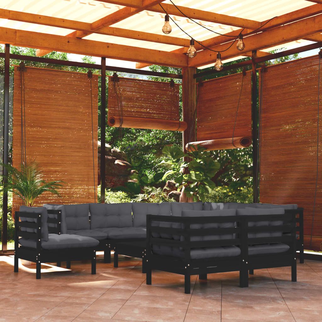 10-cz. zestaw wypoczynkowy do ogrodu, czarne poduszki, sosnowy