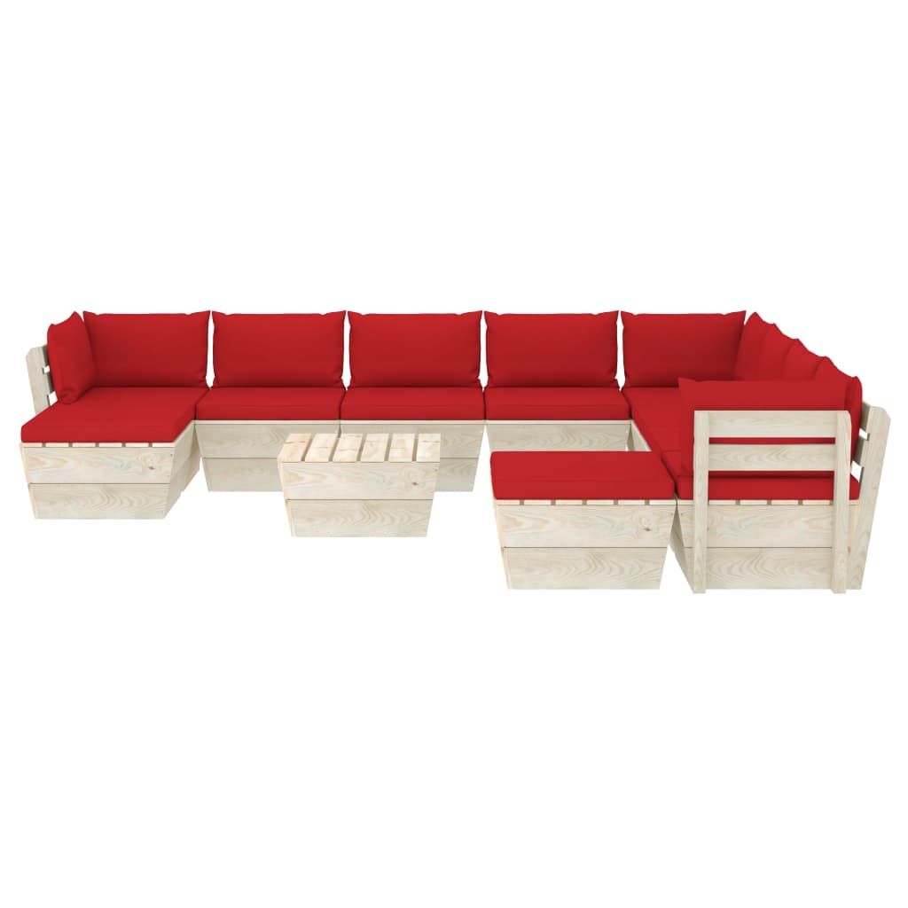 Ten 11-częściowy zestaw wypoczynkowy do ogrodu, wykonany z palet będzie doskonałym wyborem, aby się zrelaksować, zdrzemnąć, cieszyć pogodą lub pogawędzić z rodziną bądź przyjaciółmi. Drewniany komplet mebli o ponadczasowej konstrukcji z palet wniesie rustykalny urok na patio, do ogrodu lub do salonu. Zestaw mebli ogrodowych wykonano z impregnowanego drewna świerkowego, dzięki czemu jest trwały i stabilny. Charakteryzuje się on solidną konstrukcją i małymi wymaganiami związanymi z konserwacją. Stół z mocnym blatem sprawdzi się idealnie, aby postawić jedzenie i napoje w zasięgu ręki. Dzięki grubemu wypełnieniu i poszewkom ze 100% poliestru poduszki na palety są miękkie i zapewniają wyjątkowy komfort. Co więcej modułowa konstrukcja mebli pozwala na ustawienie ich w dowolnej aranżacji, zgodnie z własnym gustem. Prosimy mieć na uwadze, że drewno jest materiałem naturalnym i może wykazywać pewne niedoskonałości.