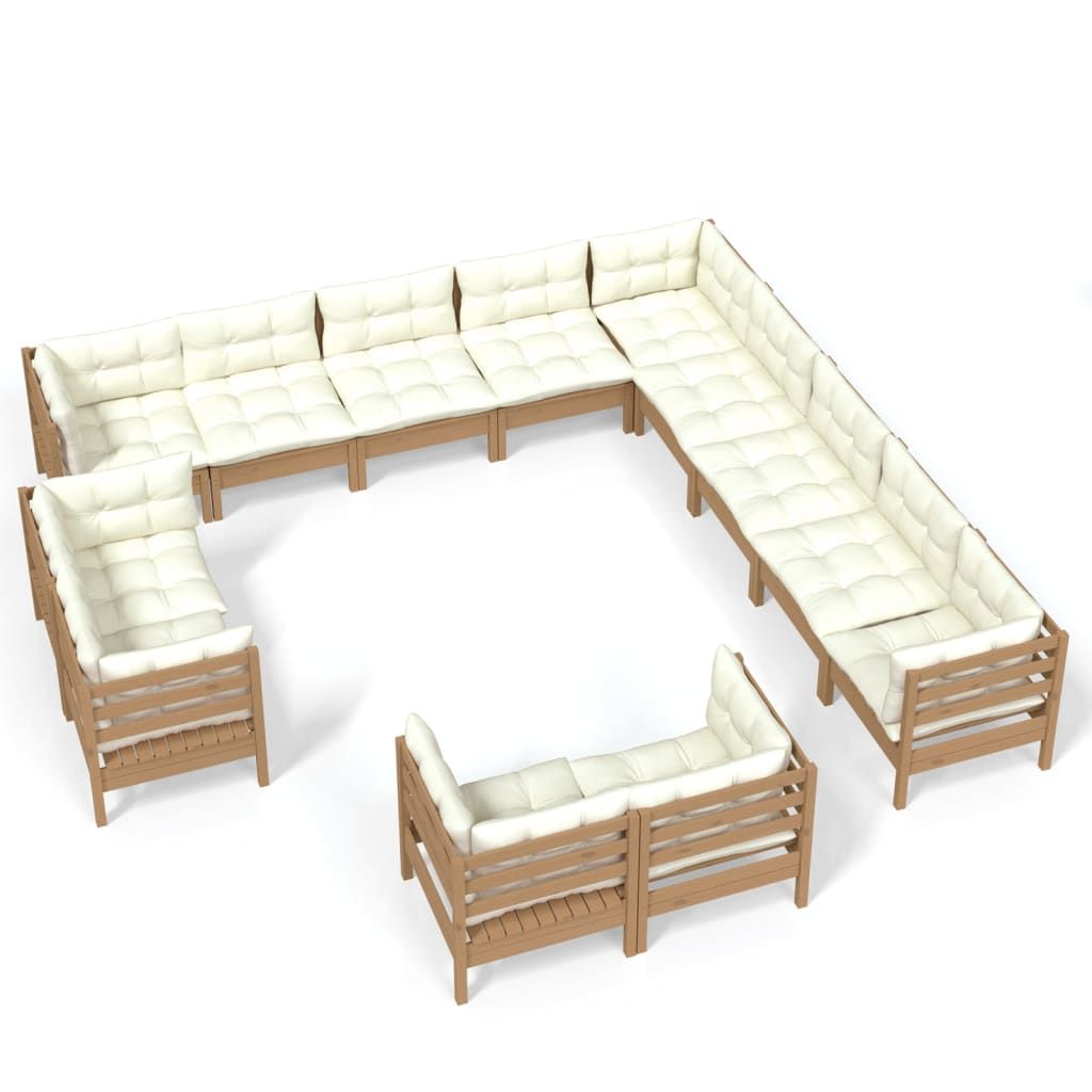 Ten ogrodowy zestaw wypoczynkowy jest znakomitym wyborem na relaks i korzystanie z pogody, a także drzemkę czy rozmowę z rodziną lub przyjaciółmi. Zestaw wypoczynkowy do ogrodu wykonano z litego drewna sosnowego, dzięki czemu jest solidny i stabilny. Poduszki oferują większy komfort. Możesz zestawiać ten komplet z innymi modułami i tworzyć własne aranżacje mebli wypoczynkowych w ogrodzie! Uwaga: aby przedłużyć żywotność mebli ogrodowych, zalecamy ich regularne czyszczenie i niepozostawianie na zewnątrz bez właściwego zabezpieczenia.Czyszczenie: użyj roztworu wody z delikatnym detergentem.Przechowywanie: jeżeli to możliwe, przechowuj produkt w chłodnym i suchym miejscu, najlepiej w pomieszczeniu. Jeśli ma on być przechowywany na zewnątrz, należy go zabezpieczyć wodoszczelnym pokrowcem. Po deszczu lub śniegu usuń nadmiar wody lub śniegu z płaskich powierzchni i osusz je. Zapewnij wystarczającą cyrkulację powietrza, aby uniknąć uszkodzeń spowodowanych przez wilgoć.