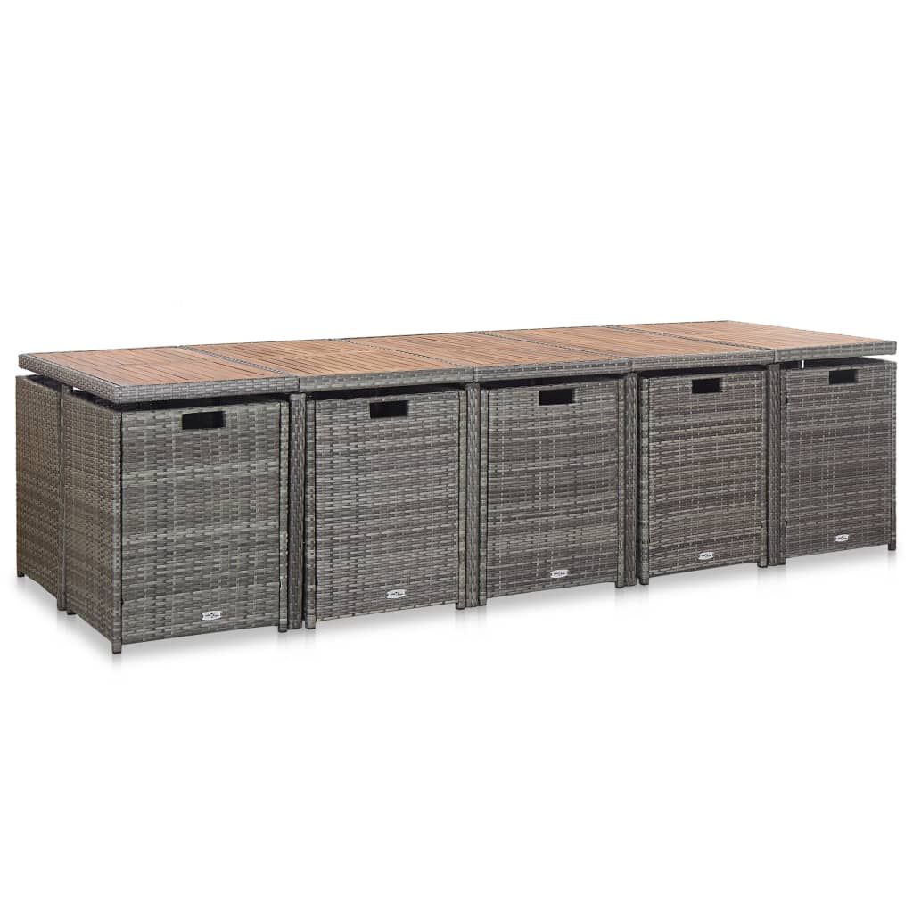 Dzięki solidnym, stalowym ramom i stylowemu designowi nasz rattanowy zestaw mebli jest idealnym wyborem do Twojej przestrzeni na zewnątrz. Zapewni on komfortowe miejsce dla Twojej rodziny w czasie posiłku, czytania lub odpoczynku. Stalowe ramy gwarantują wytrzymałość, a odporny na wodę i warunki pogodowe rattan PE łatwość czyszczenia. Konstrukcja zestawu jest lekka, dzięki czemu wszystkie elementy można łatwo przestawiać. Grube, zdejmowane poduszki na siedziska i oparcia zapewniają komfort siedzenia. Ponadto stołki można wsunąć pod krzesła, te z kolei można wsunąć pod stół, aby zaoszczędzić miejsce, gdy nie są używane! Przesyłka obejmuje 1 stół z drewnianym blatem, 10 rattanowych krzeseł, 4 stołki i 24 zdejmowane poduszki. Uwaga: na czas deszczu, śniegu lub mrozu zalecamy przykryć meble, aby zapewnić ich dłuższą trwałość.