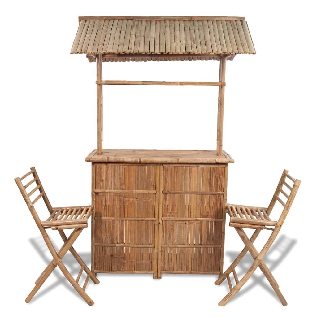 Opis produktu: Unikatowy zestaw barowy, obejmujący stolik barowy i 2 krzesła, doda nieco tropikalnego klimatu do Twojego ogrodu lub patio. Bar posiada wyróżniającą się formę z zadaszeniem, dzięki czemu stanie się głównym punktem w Twoim ogrodzie, na tarasie lub patio. Stolik barowy wyposażony jest w dwie półki z tyłu. Wykonany z odpornego na warunki pogodowe i wodę bambusa zestaw jest trwały i stabilny. Ponadto łatwo go wyczyścić przy użyciu wilgotnej ściereczki. Krzesła mogą zostać złożone, kiedy nie są w użyciu. W skład przesyłki wchodzi 1 bar i 2 krzesła. Uwaga: aby przedłużyć żywotność mebli ogrodowych, zalecamy ich regularne czyszczenie i niepozostawianie na zewnątrz bez właściwego zabezpieczenia.Czyszczenie: użyj roztworu wody z delikatnym detergentemPrzechowywanie: jeżeli to możliwe, przechowuj produkt w chłodnym i suchym miejscu, najlepiej w pomieszczeniu. Jeśli ma on być przechowywany na zewnątrz, należy go zabezpieczyć wodoszczelnym pokrowcem. Po deszczu lub śniegu usuń nadmiar wody lub śniegu z płaskich powierzchni i osusz je. Zapewnij wystarczającą cyrkulację powietrza, aby uniknąć uszkodzeń spowodowanych przez wilgoć.