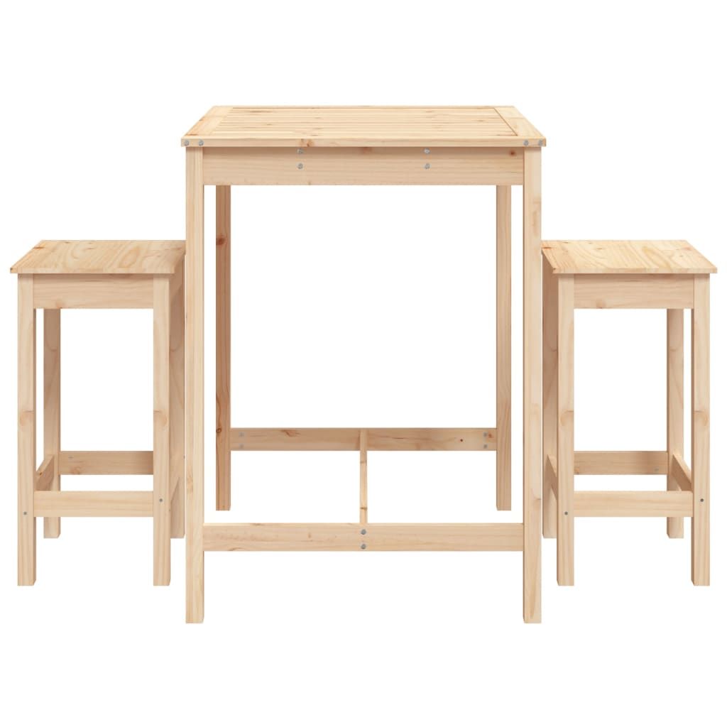 Zaserwuj sobie drinka lub zjedz smaczny posiłek z rodziną i przyjaciółmi przy tym pięknym zestawie drewnianych mebli barowych! Lite drewno sosnowe: meble barowe wykonano z litego drewna sosnowego. Drewno sosnowe to piękny, naturalny materiał. Cechuje się prostą strukturą słojów, a sęki nadają mu wyjątkowy, rustykalny wygląd.Mocny blat: solidny blat stolika barowego będzie idealnym miejscem na napoje, przekąski i przedmioty dekoracyjne.Praktyczna konstrukcja: drewniane stołki barowe nie mają oparć, możesz więc wygodnie usiąść na nich w dowolną stronę, a także wsunąć je pod blat, gdy nie są używane.Wiele zastosowań: za sprawą minimalistycznego designu zestaw mebli barowych można wkomponować w róg ogrodu, taras, balkon lub podwórko. Uwaga:Aby utrzymać meble ogrodowe w dobrej kondycji, zalecamy zabezpieczenie ich wodoodpornym pokrowcem.