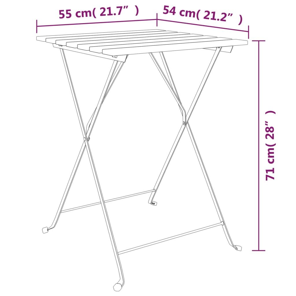 Opis produktu: Ten 3-częściowy, składany zestaw mebli bistro stanowi doskonały wybór do spożywania posiłków lub relaksu w ogrodzie, na balkonie lub tarasie. Trwały materiał: lite drewno tekowe to piękny, naturalny materiał. Drewno było sezonowane, suszone komorowo, a następnie zostało wyszlifowane, aby nadać mu bardzo gładką powierzchnię. Drewno tekowe słynie z wyjątkowej wytrzymałości i odporności na czynniki pogodowe.Stabilna rama: stalowa rama malowana proszkowo zapewnia solidność i stabilność.Praktyczny design: stolik i krzesła można łatwo złożyć, gdy nie są używane, co ułatwia ich przechowywanie i transport. Uwaga:Aby przedłużyć żywotność mebli ogrodowych, zalecamy zabezpieczenie ich wodoodpornym pokrowcem.Każdy produkt jest dostarczany wraz z instrukcją montażu dla ułatwienia tej czynności.