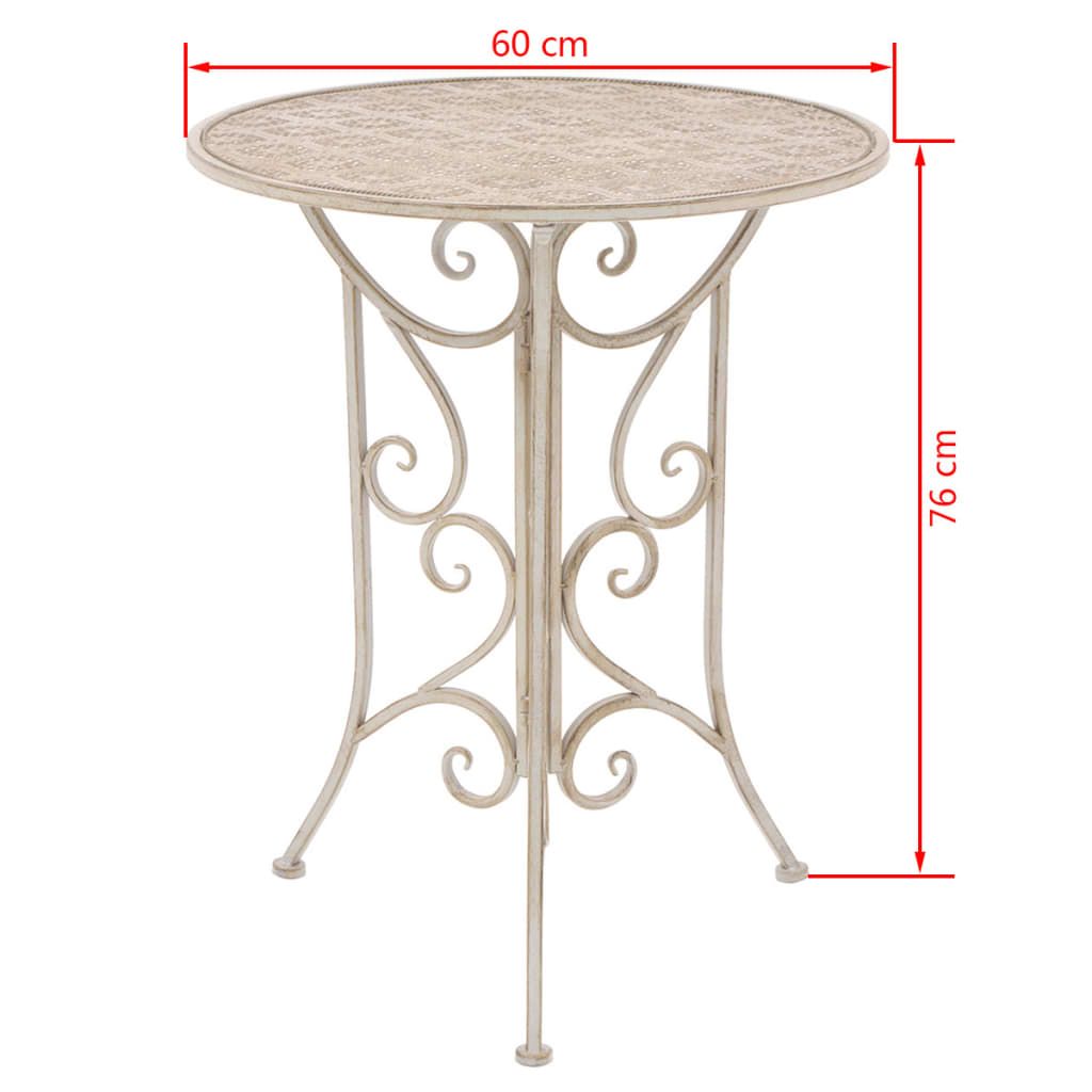 Opis produktu: Ten zestaw mebli w stylu vintage doda klasyczny akcent podczas spożywania każdego posiłku. Stanie się on centralnym punktem Twojego ogrodu, balkonu lub tarasu. Zestaw mebli bistro wykonano z malowanej proszkowo stali, która jest odporna na warunki atmosferyczne i bardzo trwała. Fantazyjne, ręcznie malowane dekoracje i ozdobne rdzewienia sprawią, że zestaw będzie wyróżniał się w każdym ogrodzie, na tarasie lub balkonie. Klasyczny zestaw mebli ogrodowych jest bardzo łatwy do czyszczenia z użyciem wilgotnej szmatki. Krzesła można łatwo złożyć, aby zaoszczędzić miejsce, gdy nie są używane. Przesyłka zawiera 1 stolik i 2 składane krzesła.