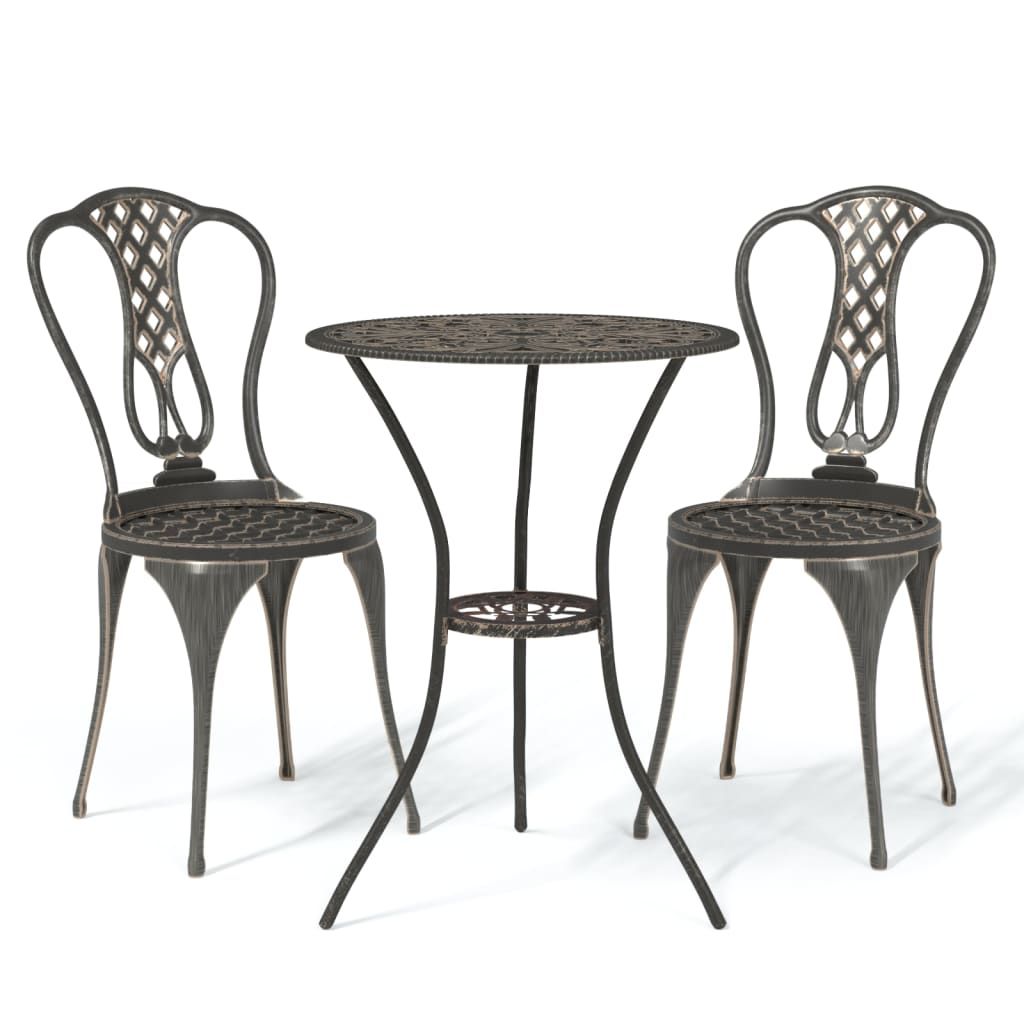 Opis produktu: Ten zestaw mebli bistro doda odrobinę luksusu do każdego posiłku. Rozmowy lub odpoczynek przy filiżance kawy staną się jeszcze przyjemniejsze dzięki ozdobnemu a zarazem funkcjonalnemu kompletowi mebli do ogrodu. Komplet mebli bistro wykonano ze stopu aluminium, który jest odporny na czynniki pogodowe i bardzo trwały. Kwiatowy wzór wniesie odrobinę romantyzmu do każdego ogrodu, patio lub na taras. Uwaga: aby przedłużyć żywotność mebli ogrodowych, zalecamy zabezpieczenie ich wodoodpornym pokrowcem.