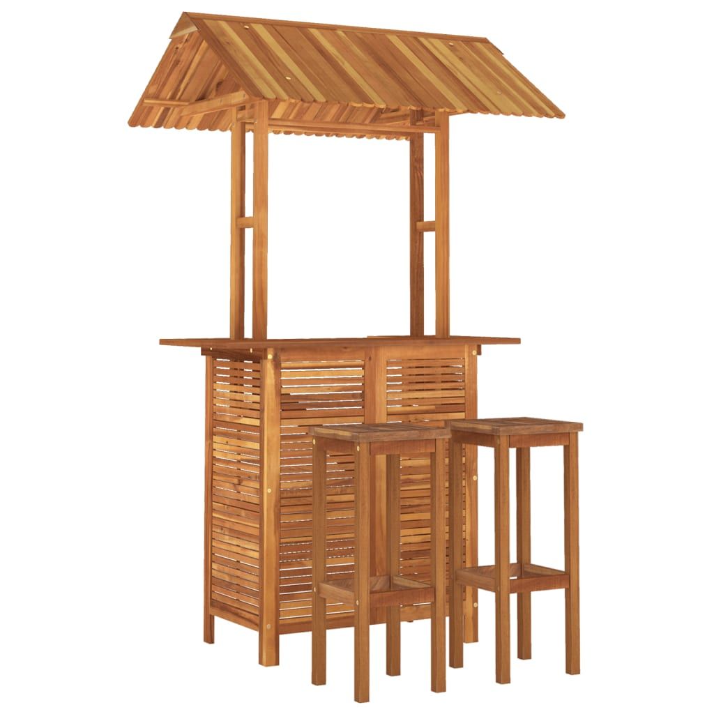 Ten zestaw drewnianych mebli barowych cechuje się eleganckim wzornictwem i stanie się punktem centralnym Twojego ogrodu, patio lub tarasu. Praktyczny materiał: lite drewno akacjowe to piękny, naturalny materiał. To tropikalne, twarde drewno charakteryzuje się zwartą strukturą, trwałością i wytrzymałością. Co więcej, wykończenie powierzchni olejem sprawia, że ten stół i krzesła są łatwe w czyszczeniu.Wytrzymała drewniana konstrukcja: wykonane z drewna ramy tego zestawu zapewniają mu trwałość i stabilność.Praktyczny dach: stolik bistro został zaprojektowany z dachem, który zapewnia cień i ochronę przed bezpośrednim działaniem promieni słonecznych.Wygodne stołki barowe: podnóżki zapewniają dodatkowy komfort podczas siedzenia.Ponadczasowy wygląd: elegancki design drewnianego stolika i krzeseł bistro czynią te meble ponadczasową inwestycją do Twojego domu. Uwaga:Aby przedłużyć żywotność mebli ogrodowych, zalecamy zabezpieczenie ich wodoodpornym pokrowcem.