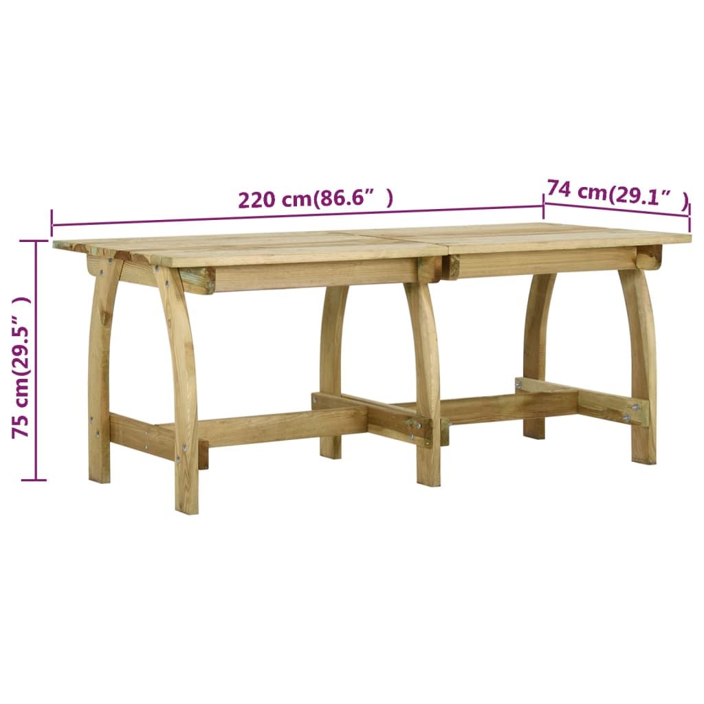 Opis produktu: Stylowy, a przy tym praktyczny zestaw mebli ogrodowych sprawi, że Twój salon na świeżym powietrzu zyska klasę! Wykonany z impregnowanego na zielono drewna sosnowego zestaw mebli jest bardzo mocny, trwały i odporny na korozję. Stanowi on idealny wybór do relaksu w romantycznym ogrodzie przy domu wiejskim lub nad idyllicznym oczkiem wodnym oraz spożywania posiłków z rodziną i przyjaciółmi. Prosimy mieć na uwadze, że drewno jest materiałem naturalnym i może wykazywać pewne niedoskonałości. Uwaga: aby przedłużyć żywotność mebli ogrodowych, zalecamy zabezpieczenie ich wodoodpornym pokrowcem.