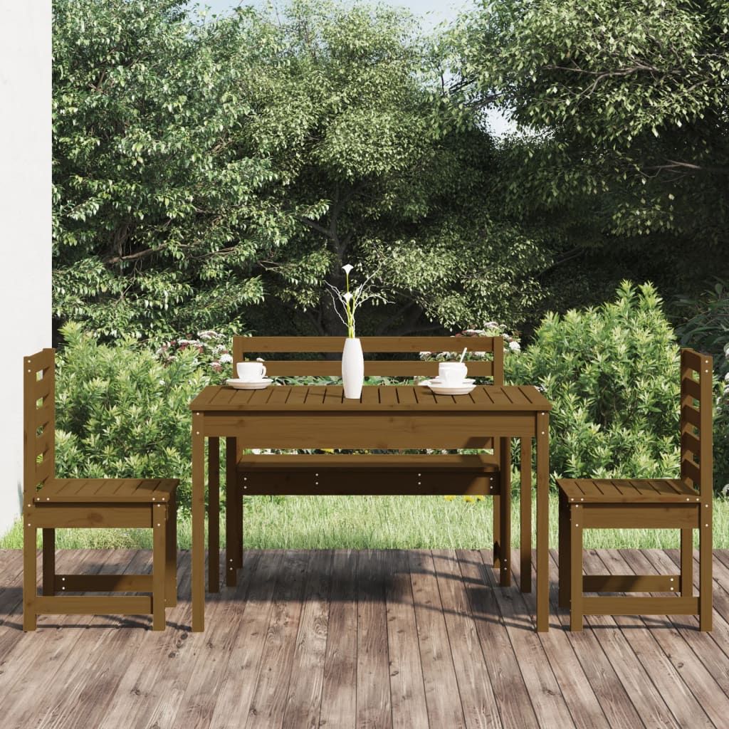 Opis produktu: Ten klasyczny, drewniany zestaw mebli ogrodowych sprawdzi się doskonale na zewnątrz oraz stanie się głównym punktem Twojego ogrodu, patio, tarasu itp. Lite drewno sosnowe: zestaw ten wykonano z litego drewna sosnowego. Lite drewno sosnowe to piękny, naturalny materiał. Drewno sosnowe ma prostą strukturę słojów, a sęki nadają mu wyjątkowy, rustykalny wygląd.Praktyczny blat: stół oferuje solidny blat. Możesz postawić na nim przekąski, napoje oraz ulubione dekoracje.Komfort siedzenia: wykonane z listew siedzisko i oparcie krzesła ogrodowego zapewniają doskonałe podparcie.Wiele zastosowań: zestaw mebli o prostym i ponadczasowym designie idealnie sprawdzi się na balkonach, werandach, tarasach i w ogrodach. Uwaga:Aby utrzymać meble ogrodowe w dobrej kondycji, zalecamy zabezpieczenie ich wodoodpornym pokrowcem.