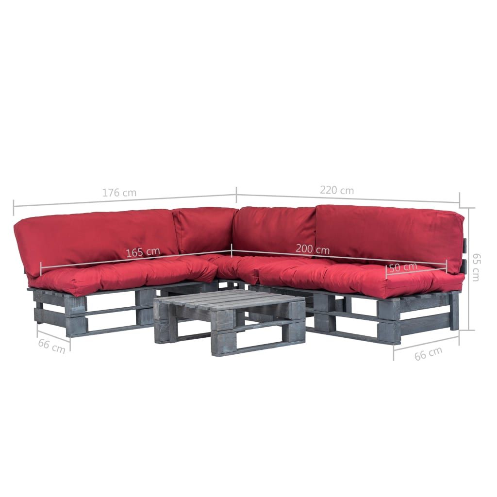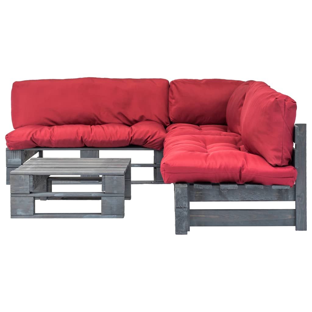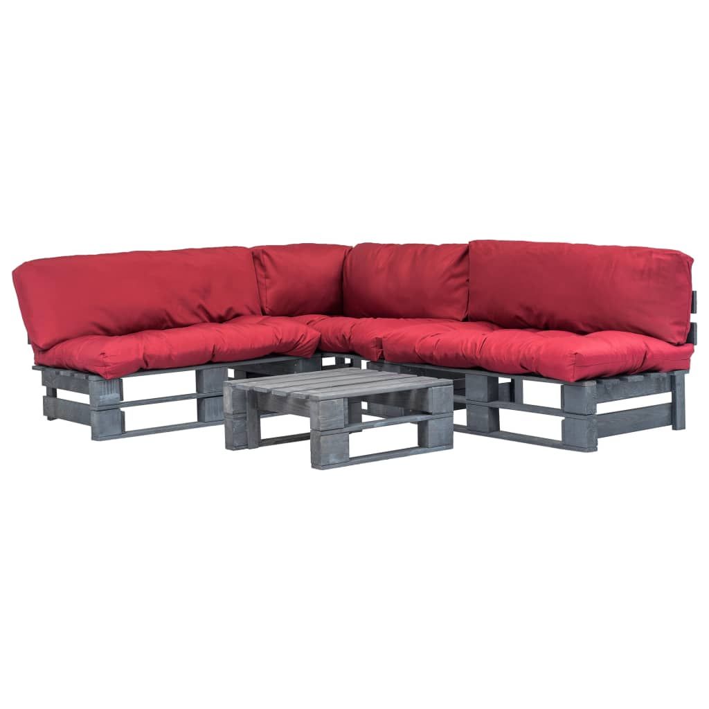 4-cz. zestaw ogrodowy, czerwone poduszki, palety z drewna