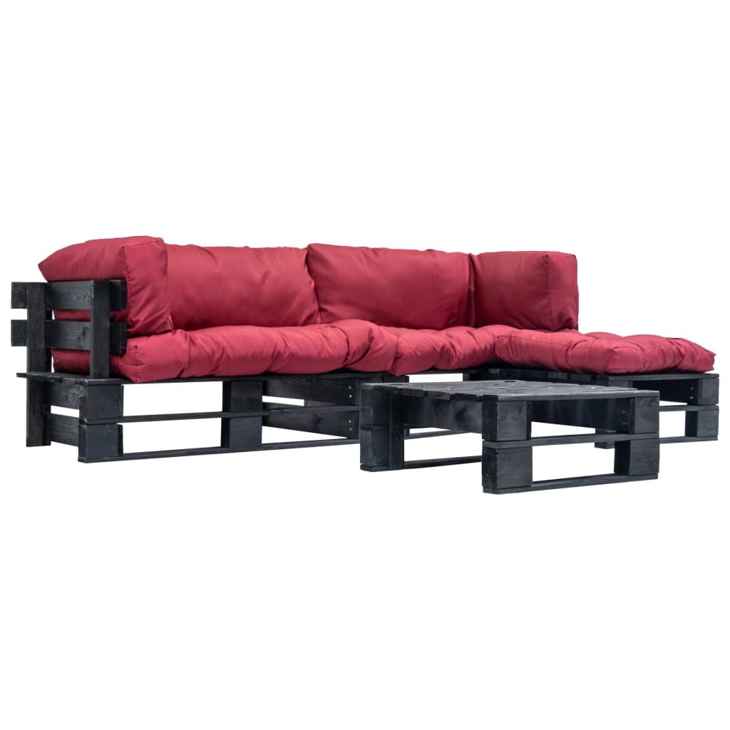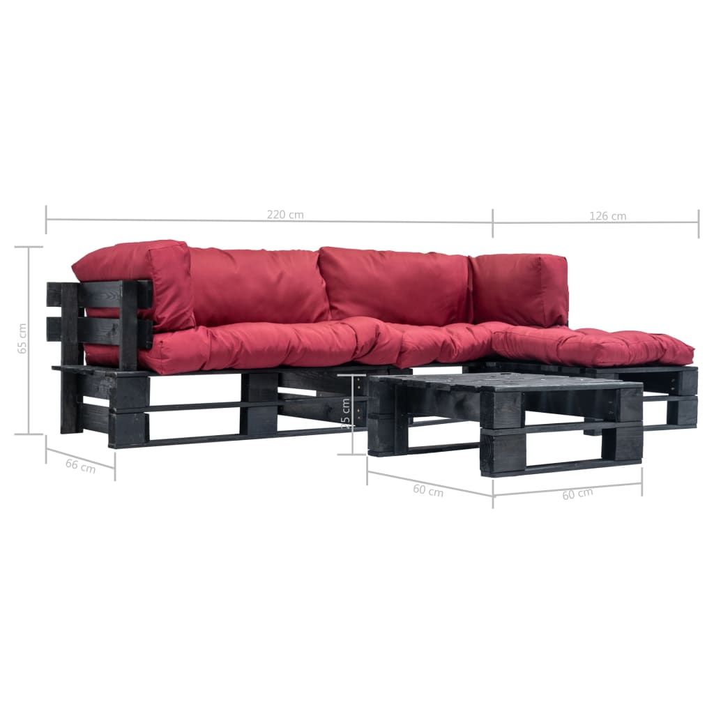 4-cz. zestaw ogrodowy, czerwone poduszki, palety z drewna