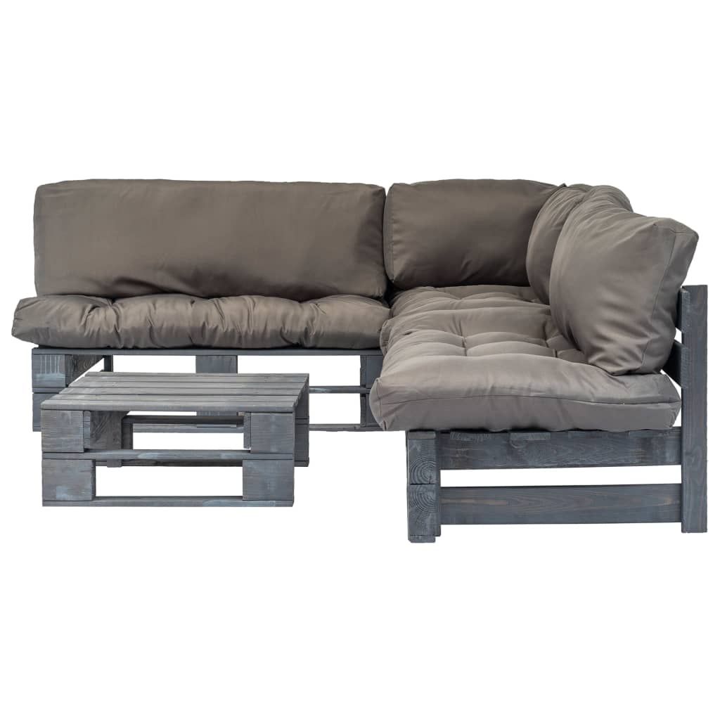 4-cz. zestaw ogrodowy, szare poduszki, palety z drewna