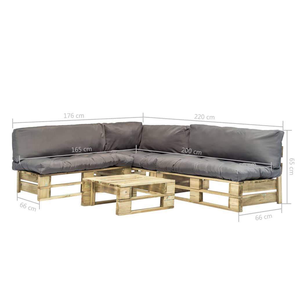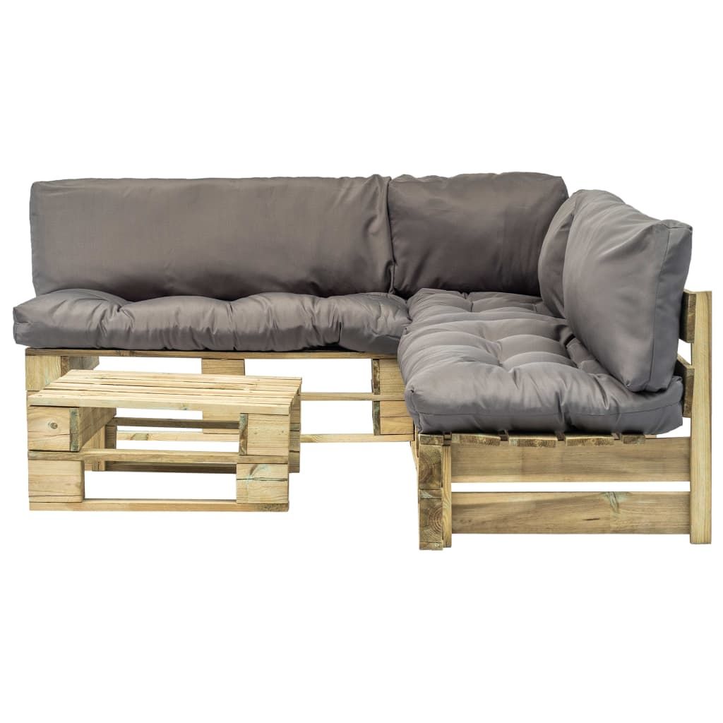 4-cz. zestaw ogrodowy, szare poduszki, palety z drewna