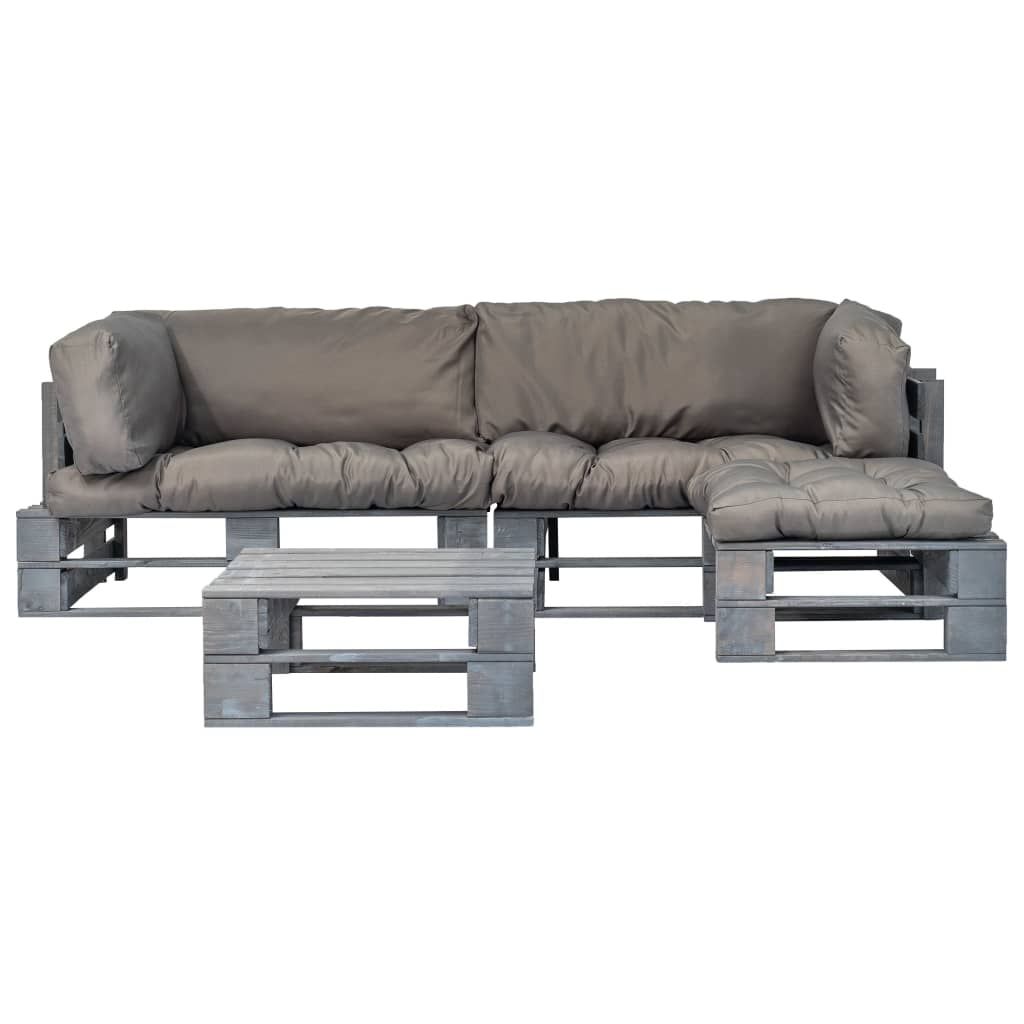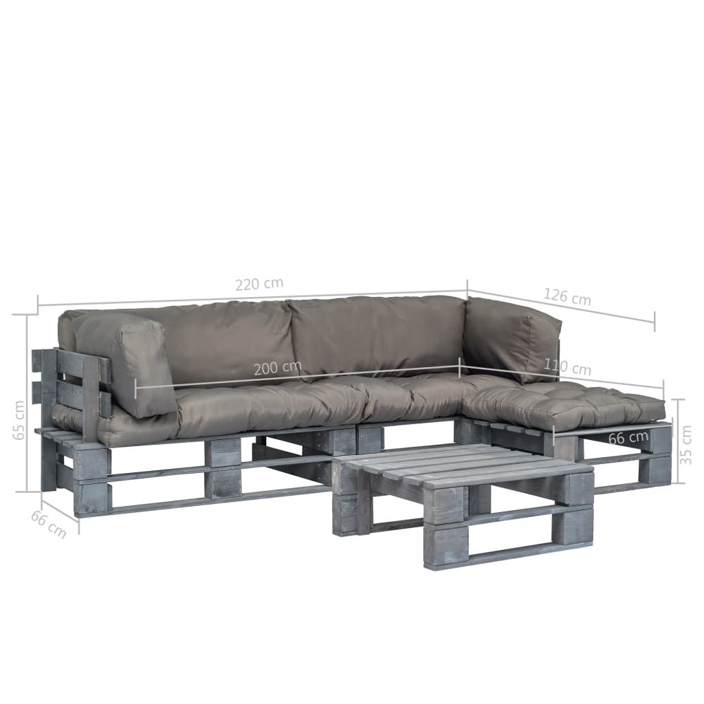 4-cz. zestaw ogrodowy, szare poduszki, palety z drewna