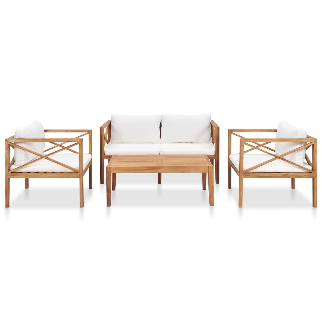 Zestaw mebli wypoczynkowych z litego drewna wyróżnia się konstrukcją krzyżakową i miękkimi poduszkami, stanowiąc doskonałe połączenie stylu i funkcjonalności. Dzięki niemu możesz zrelaksować się ze swoją rodziną lub znajomymi w ogrodzie. Produkt wykonany został z niezwykle trwałego, twardego drewna tekowego, które było sezonowane, suszone komorowo, a następnie drobno oszlifowane, by nadać mu bardzo gładką powierzchnię. Drewno tekowe słynie z wyjątkowej wytrzymałości i odporności na warunki atmosferyczne, dzięki czemu jest znacznie bardziej odpowiednie do produkcji mebli ogrodowych niż jakikolwiek inny rodzaj drewna. Tek to idealny wybór, jeśli chcesz kupić trwałe meble ogrodowe. Grubo wyściełane poduszki na siedzisko i oparcie zapewniają większą wygodę. Szlifowana powierzchnia jest łatwa do czyszczenia za pomocą wilgotnej ściereczki. Komplet jest również lekki i łatwy do przenoszenia. Ułatwia tworzenie różnych aranżacji i dopasowanie do indywidualnych potrzeb. Stanie się centralnym punktem Twojego ogrodu lub patio. Uwaga: zalecamy przykrycie zestawu na czas deszczu, śniegu i mrozu.