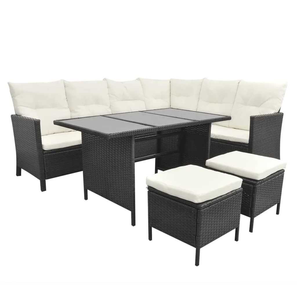 Opis produktu: Nasz zestaw eleganckich, komfortowych mebli rattanowych stanie się prawdziwą atrakcją Twojego ogrodu lub tarasu. W jego skład wchodzi również stół jadalniany i miękkie poduszki, co czyni go idealnym kompletem mebli do serwowania posiłków na świeżym powietrzu lub po prostu relaksu i czerpania radości z dobrej pogody. Dzięki odpornemu na warunki pogodowe i wodę rattanowi PE zestaw wypoczynkowy jest łatwy do czyszczenia, wytrzymały i odpowiedni do użytku na zewnątrz. Meble mają mocną, malowaną proszkowo, stalową ramę, dzięki czemu są niezwykle trwałe. Blat ze szkła hartowanego jest mocny i łatwy do czyszczenia. W skład zestawu wchodzą także komfortowe poduszki. Poliestrowe poszewki mają zapięcia na suwak, dzięki czemu można je zdjąć i wyprać. Rattanowy komplet jest niezwykle lekki, co umożliwia jego swobodne przestawianie, by wkomponować idealnie w otoczenie. Przesyłka zawiera: 1 sofę w kształcie litery L, 1 stół, 2 pufy, 7 poduszek na oparcia i 5 na siedziska. Uwaga: zalecamy przykrycie zestawu na czas deszczu, śniegu i mrozu.