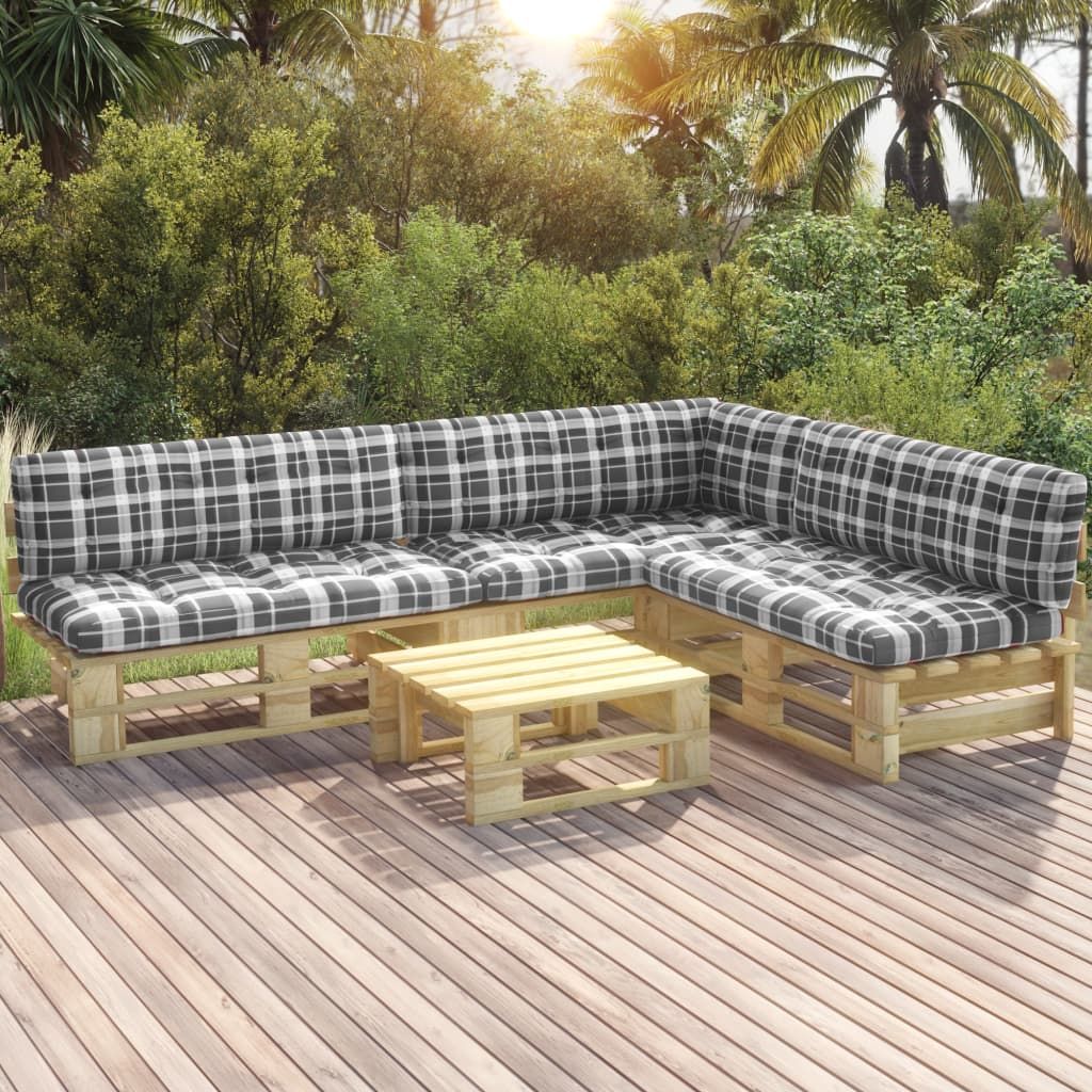 Ten ogrodowy zestaw mebli wypoczynkowych z drewnianych palet stanowi znakomity wybór, aby się zrelaksować i nacieszyć dobrą pogodą albo zdrzemnąć lub porozmawiać z rodziną lub przyjaciółmi. Za sprawą ponadczasowej konstrukcji z palet ten ogrodowy komplet wniesie odrobinę rustykalnego uroku na Twoje patio, do ogrodu lub do salonu. Wykonany z impregnowanego drewna sosnowego zestaw mebli ogrodowych jest trwały i odporny na czynniki atmosferyczne. Charakteryzuje się solidną konstrukcją i łatwością utrzymania. Wraz z dołączonymi poduszkami zapewni najwyższy komfort Tobie i Twoim gościom. Uwaga: aby przedłużyć żywotność mebli ogrodowych, zalecamy zabezpieczenie ich wodoodpornym pokrowcem.