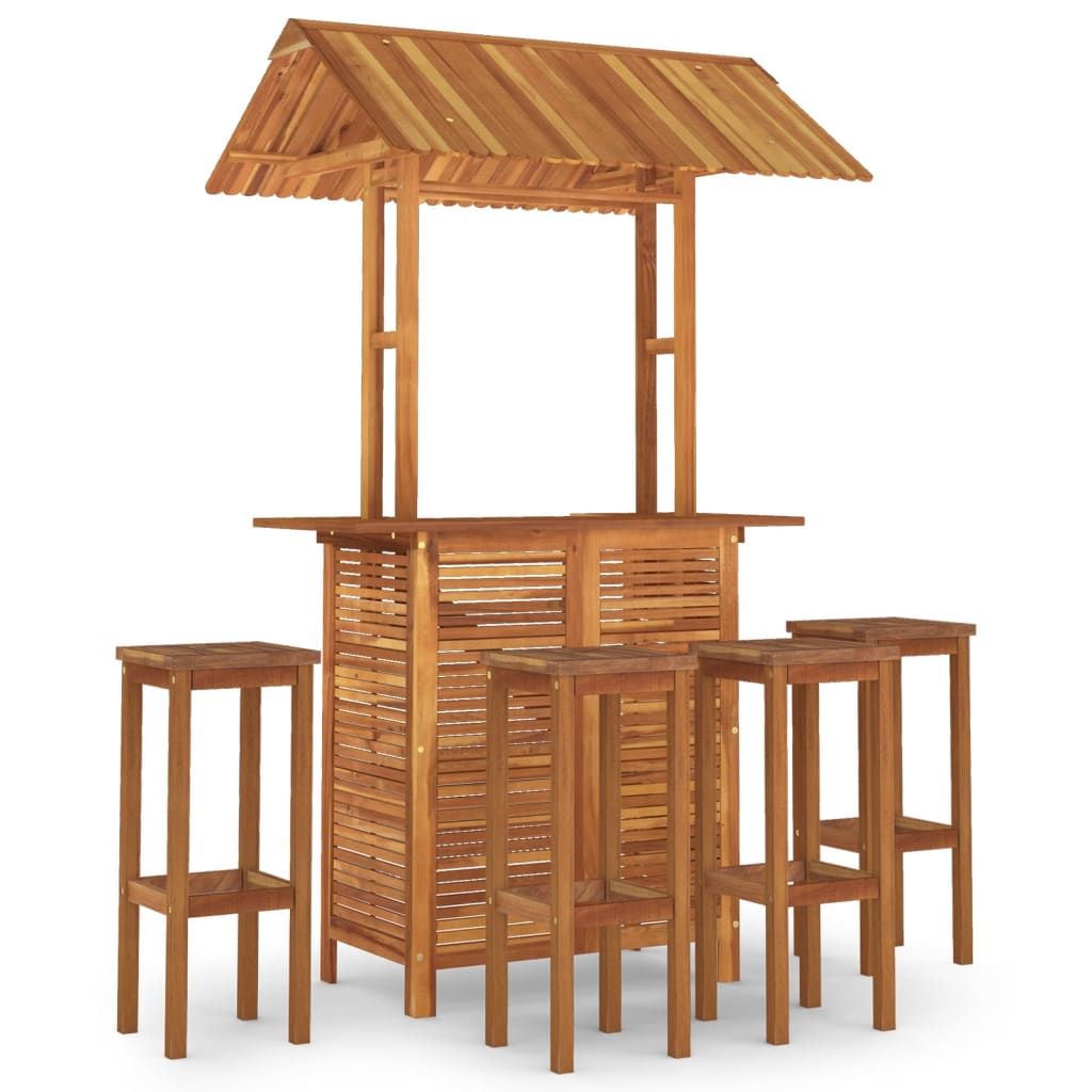 Ten zestaw drewnianych mebli barowych cechuje się eleganckim wzornictwem i stanie się punktem centralnym Twojego ogrodu, patio lub tarasu. Praktyczny materiał: lite drewno akacjowe to piękny, naturalny materiał. To tropikalne, twarde drewno charakteryzuje się zwartą strukturą, trwałością i wytrzymałością. Co więcej, wykończenie powierzchni olejem sprawia, że ten stół i krzesła są łatwe w czyszczeniu.Wytrzymała drewniana konstrukcja: wykonane z drewna ramy tego zestawu zapewniają mu trwałość i stabilność.Praktyczny dach: stolik bistro został zaprojektowany z dachem, który zapewnia cień i ochronę przed bezpośrednim działaniem promieni słonecznych.Wygodne stołki barowe: podnóżki zapewniają dodatkowy komfort podczas siedzenia.Ponadczasowy wygląd: elegancki design drewnianego stolika i krzeseł bistro czynią te meble ponadczasową inwestycją do Twojego domu. Uwaga:Aby przedłużyć żywotność mebli ogrodowych, zalecamy zabezpieczenie ich wodoodpornym pokrowcem.