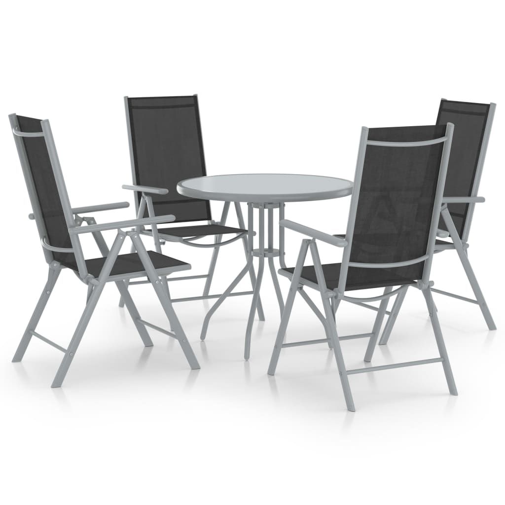 Opis produktu: Ten praktyczny i stylowy zestaw jadalniany do ogrodu jest idealny do odpoczynku lub spożywania posiłków w ogrodzie lub na patio. Malowana proszkowo, aluminiowa rama sprawia, że zestaw mebli jest bardzo wytrzymały i trwały. Krzesła ogrodowe mają miękkie w dotyku siedziska oraz oparcia wykonane z tkaniny textilene, które można ustawiać w 7 pozycjach, dzięki czemu zawsze możesz znaleźć najwygodniejsze ustawienie. Można je złożyć, aby zaoszczędzić miejsce, gdy nie są używane. Stół posiada blat ze szkła, który jest łatwy do czyszczenia i nadaje się do użytku na zewnątrz. Uwaga: aby przedłużyć żywotność mebli ogrodowych, zalecamy zabezpieczenie ich wodoodpornym pokrowcem.