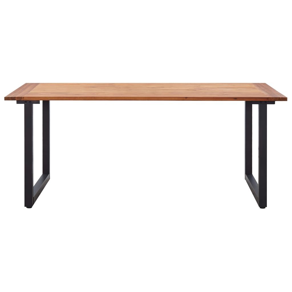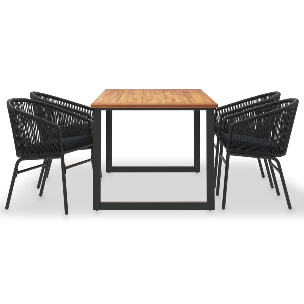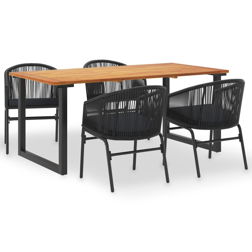 Ten ogrodowy zestaw jadalniany łączy w sobie styl i funkcjonalność, by stać się głównym punktem Twojego ogrodu lub patio! Stół ogrodowy ma blat z litego drewna akacjowego - tropikalnego drewna, które jest odporne na warunki atmosferyczne i bardzo trwałe. Metalowa konstrukcja malowana proszkowo jest odporna na korozję i rdzę. Nadaje też meblowi industrialny wygląd. Zestaw krzeseł, wykonany z rattanu PVC oplecionego na starannie lakierowanej, stalowej ramie, jest stabilny i odporny na niekorzystne warunki atmosferyczne oraz promieniowanie UV. Wygodne poduszki mają pokrycie z wodoodpornej tkaniny poliestrowej, dzięki czemu są odpowiednie do użytku na zewnątrz. Ten zestaw ogrodowy jest również łatwy w montażu.