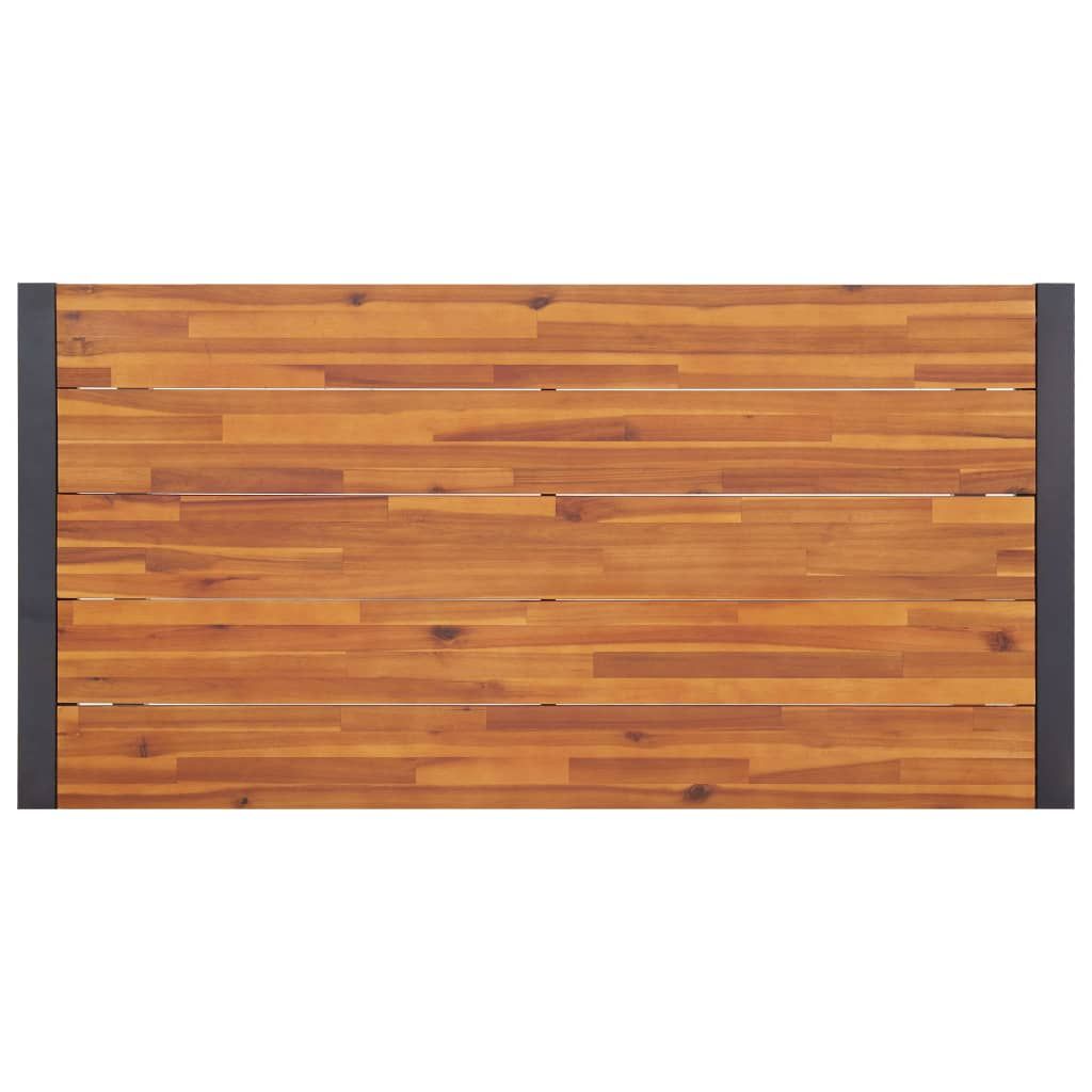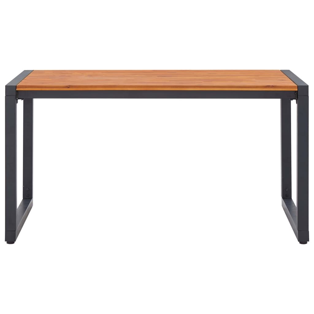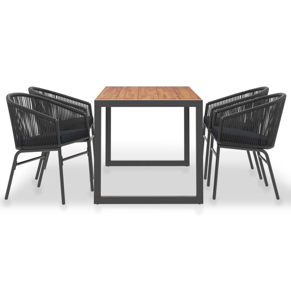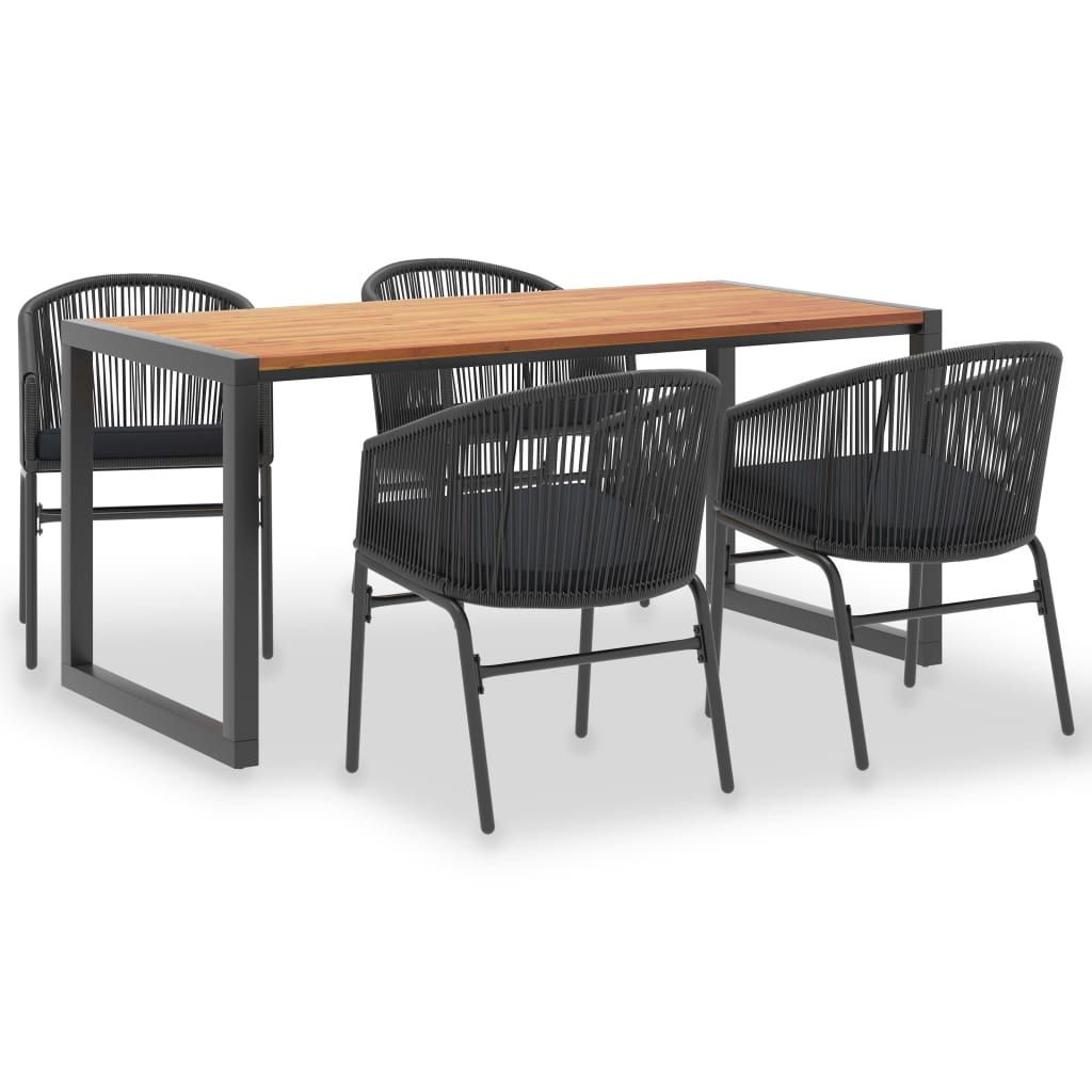 Opis produktu: Ten ogrodowy zestaw jadalniany łączy w sobie styl i funkcjonalność, by stać się głównym punktem Twojego ogrodu lub patio! Stół ogrodowy ma blat z litego drewna akacjowego - tropikalnego drewna, które jest odporne na warunki atmosferyczne i bardzo trwałe. Metalowa konstrukcja malowana proszkowo jest odporna na korozję i rdzę. Nadaje też meblowi industrialny wygląd. Zestaw krzeseł, wykonany z rattanu PVC oplecionego na starannie lakierowanej, stalowej ramie, jest stabilny i odporny na niekorzystne warunki atmosferyczne oraz promieniowanie UV. Wygodne poduszki mają pokrycie z wodoodpornej tkaniny poliestrowej, dzięki czemu są odpowiednie do użytku na zewnątrz. Ten zestaw ogrodowy jest również łatwy w montażu.
