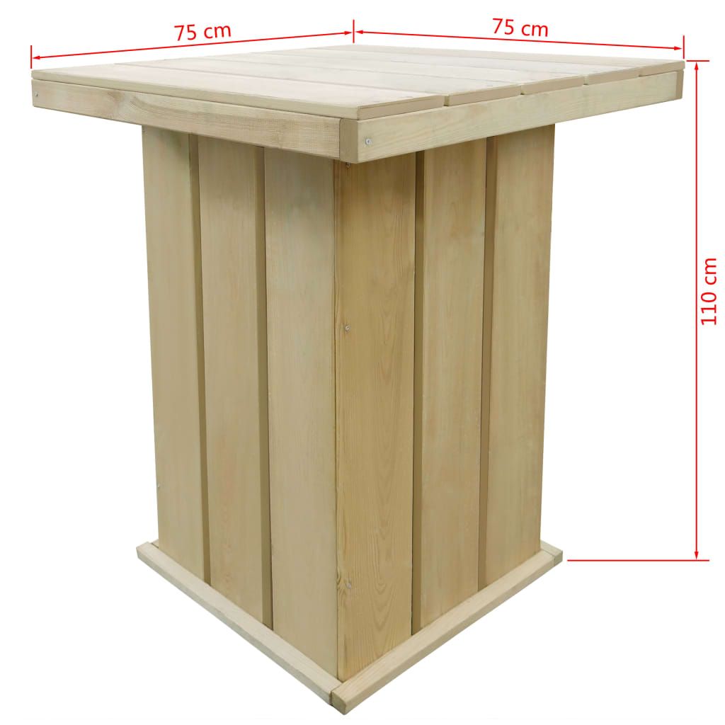 Klasyczny zestaw drewnianych mebli ogrodowych, składający się z wysokiego stołu i czterech stołków barowych, doda odrobinę rustykalnego uroku Twojemu tarasowi lub terenowi wokół domu. Zestaw mebli wykonano z impregnowanego drewna sosnowego, które jest odporne na niszczenie i bardzo wytrzymałe, dzięki czemu doskonale nadaje się do użytku na zewnątrz. Stołki barowe zapewniają podporę i wygodę siedzenia, a stolik jest idealny, by postawić na nim drinki, przekąski i inne przedmioty. Zrelaksuj się po całym dniu na tym zestawie uroczych mebli ogrodowych! Montaż jest bardzo łatwy. Prosimy mieć na uwadze, że drewno jest materiałem naturalnym i może wykazywać pewne niedoskonałości.
