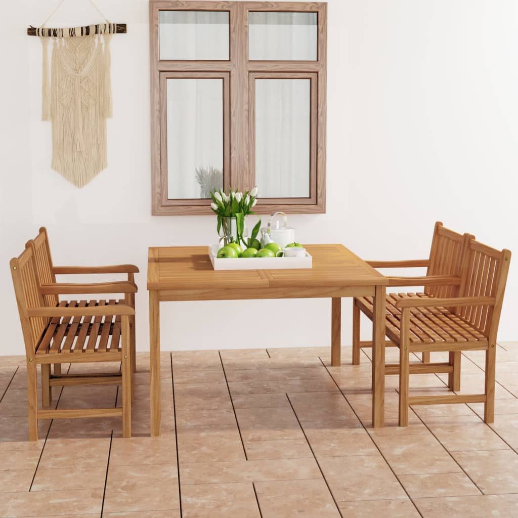 Ten drewniany zestaw doda odrobinę naturalnego uroku Twojej kuchni, ogrodowi lub patio. Mebel wykonany został z niezwykle trwałego, twardego drewna tekowego, które było sezonowane, suszone komorowo, a następnie drobno szlifowane, by nadać mu bardzo gładką powierzchnię. Drewno tekowe znane jest z wyjątkowej wytrzymałości i odporności na warunki atmosferyczne, dzięki czemu jest znacznie bardziej odpowiednie do produkcji mebli ogrodowych niż jakikolwiek inny rodzaj drewna. Tek to idealny wybór, jeśli chcesz kupić trwałe meble ogrodowe. Piękne wykończenie na bazie wody nadaje drewnu ciepły kolor. Dzięki wyjątkowo grubemu blatowi i masywnym nogom stolik jest bardzo trwały i zapewni wygodę Twoim gościom. Krzesła charakteryzują się eleganckim stylem, który od razu wpisuje się w każdą przestrzeń. Za sprawą wodoodporności i klasycznego wyglądu ten zestaw mebli możesz ustawić w dowolnym miejscu - wewnątrz lub na zewnątrz pomieszczeń!
