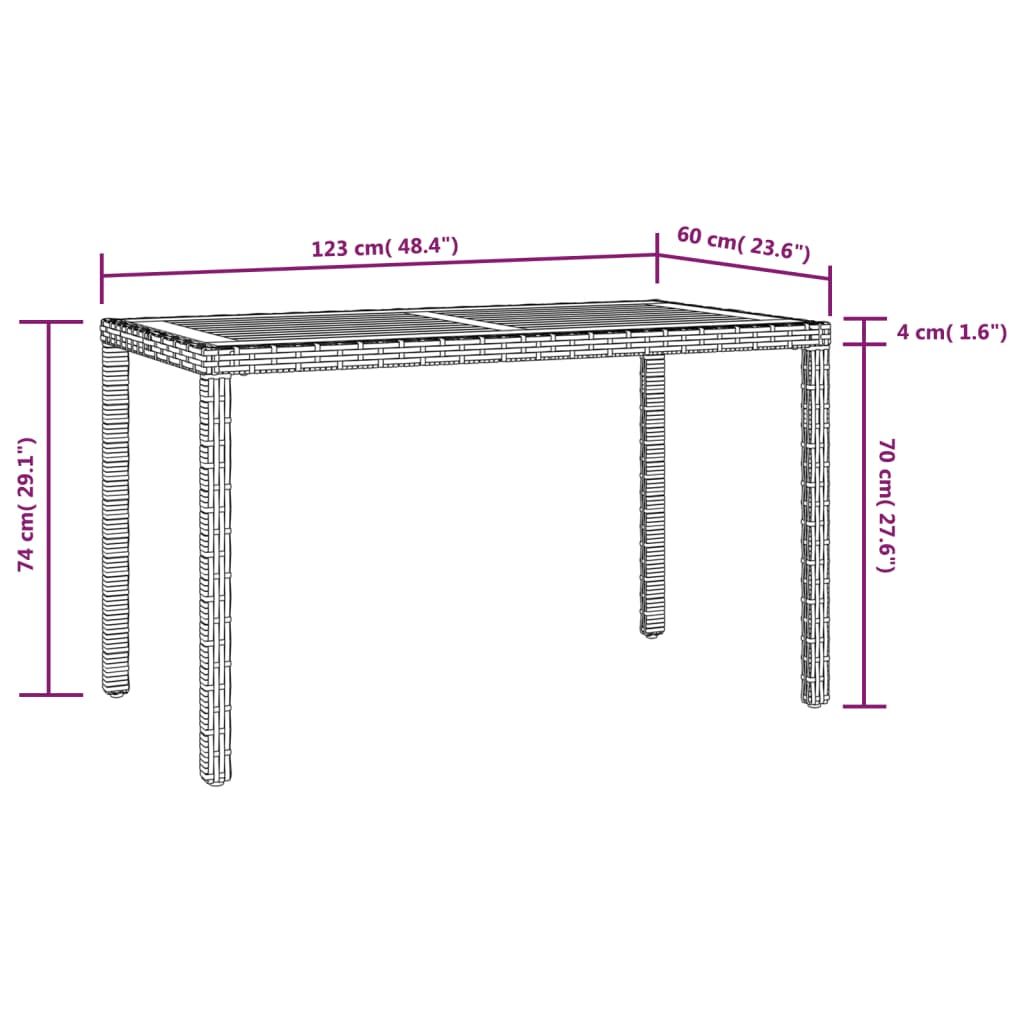 • Materiał: stalowa rama + rattan PE + blat z drewna akacjowego o naturalnym wykończeniu olejowym