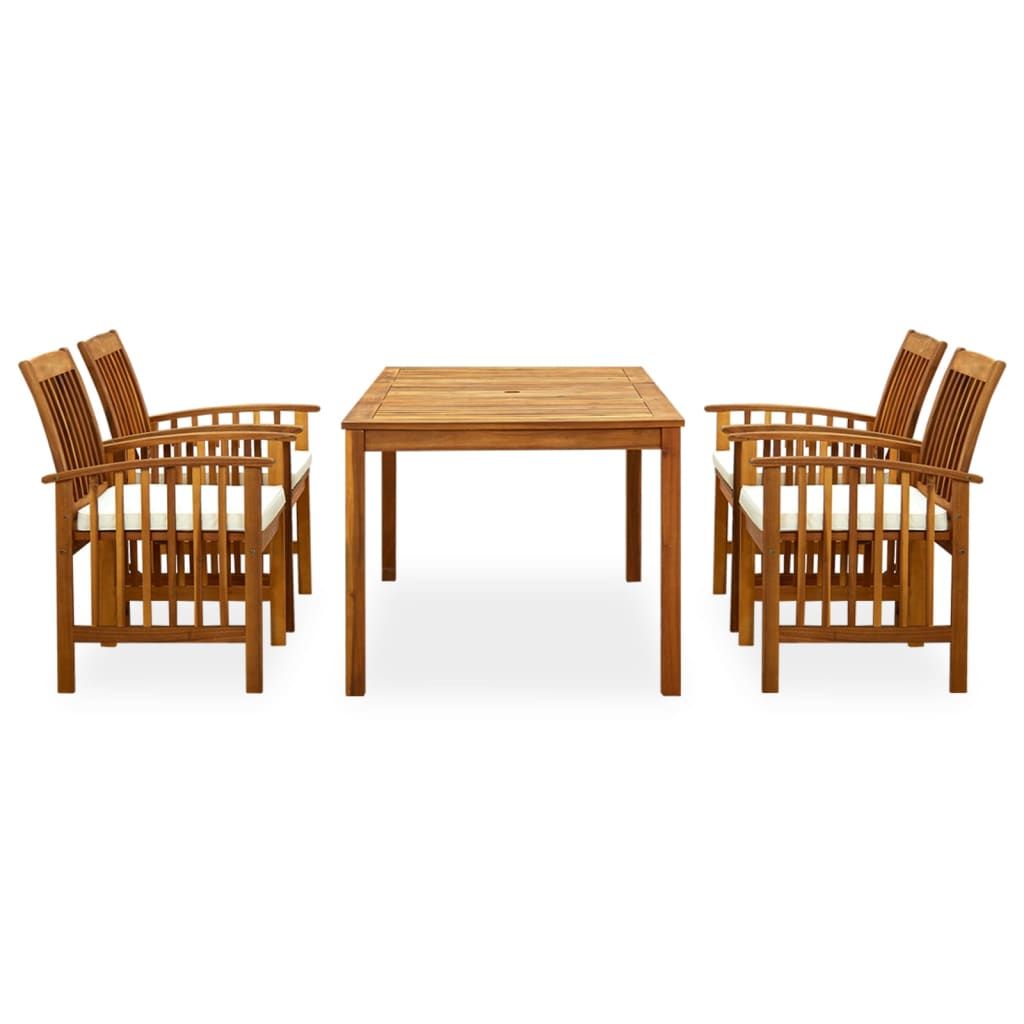 Opis produktu: Stwórz fascynującą i spójną estetykę w swojej przestrzeni na świeżym powietrzu dzięki naszemu zestawowi jadalnianemu do ogrodu! Stół jadalniany wykonany jest z litego drewna akacjowego, twardego drewna o gęstych słojach, co czyni go solidnym, trwałym i łatwym w utrzymaniu. Drewniany blat może służyć do umieszczania potraw, napojów i innych przedmiotów. Krzesła stołowe charakteryzują się drewnianą ramą wykończoną olejem przez co nadają klasyczny wygląd Twojemu patio lub ogródkowi, jednocześnie wprowadzając do przestrzeni zewnętrznej naturalny charakter. Grubo wyściełane poduszki oferują również dodatkowy komfort siedzenia podczas odpoczynku. Co więcej zestaw ten jest łatwy do czyszczenia wilgotną ściereczką. Uwaga: aby przedłużyć żywotność mebli ogrodowych, zalecamy zabezpieczenie ich wodoodpornym pokrowcem.