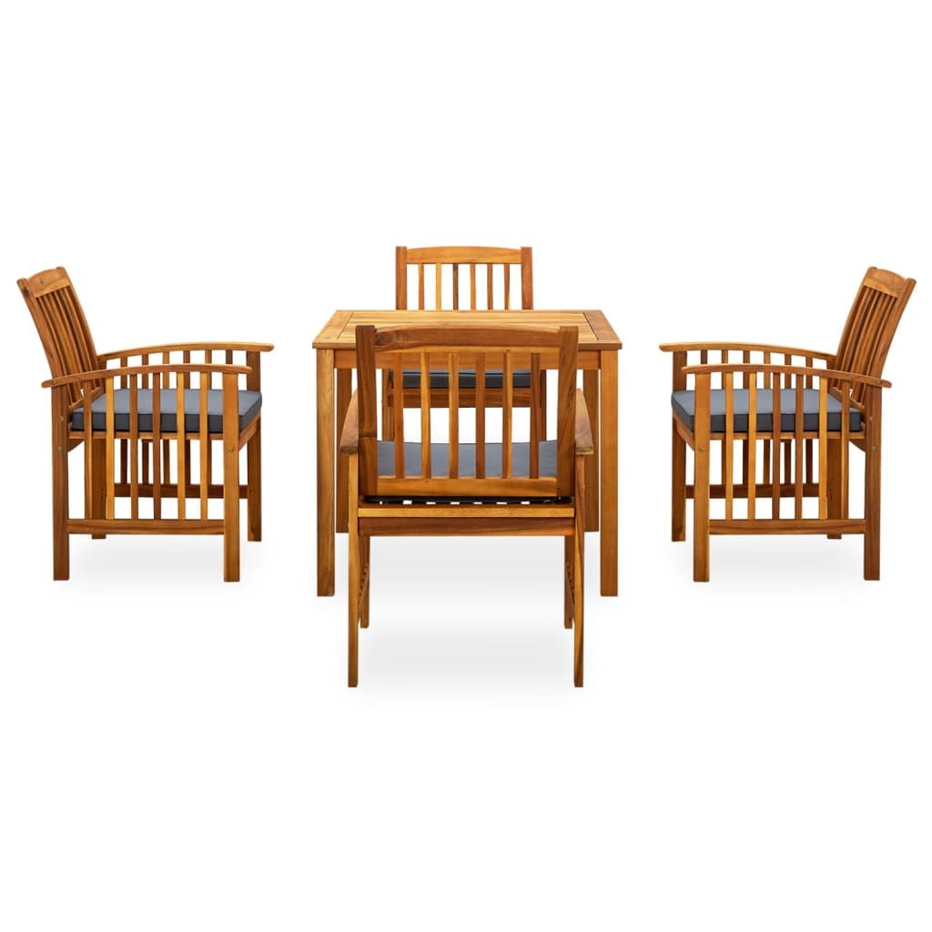 Stwórz fascynującą i spójną estetykę w swojej przestrzeni na świeżym powietrzu dzięki naszemu zestawowi jadalnianemu do ogrodu! Stół jadalniany wykonany jest z litego drewna akacjowego, twardego drewna o gęstych słojach, co czyni go solidnym, trwałym i łatwym w utrzymaniu. Drewniany blat może służyć do umieszczania potraw, napojów i innych przedmiotów. Krzesła stołowe charakteryzują się drewnianą ramą wykończoną olejem przez co nadają klasyczny wygląd Twojemu patio lub ogródkowi, jednocześnie wprowadzając do przestrzeni zewnętrznej naturalny charakter. Grubo wyściełane poduszki oferują również dodatkowy komfort siedzenia podczas odpoczynku. Co więcej zestaw ten jest łatwy do czyszczenia wilgotną ściereczką. Uwaga: aby przedłużyć żywotność mebli ogrodowych, zalecamy zabezpieczenie ich wodoodpornym pokrowcem.