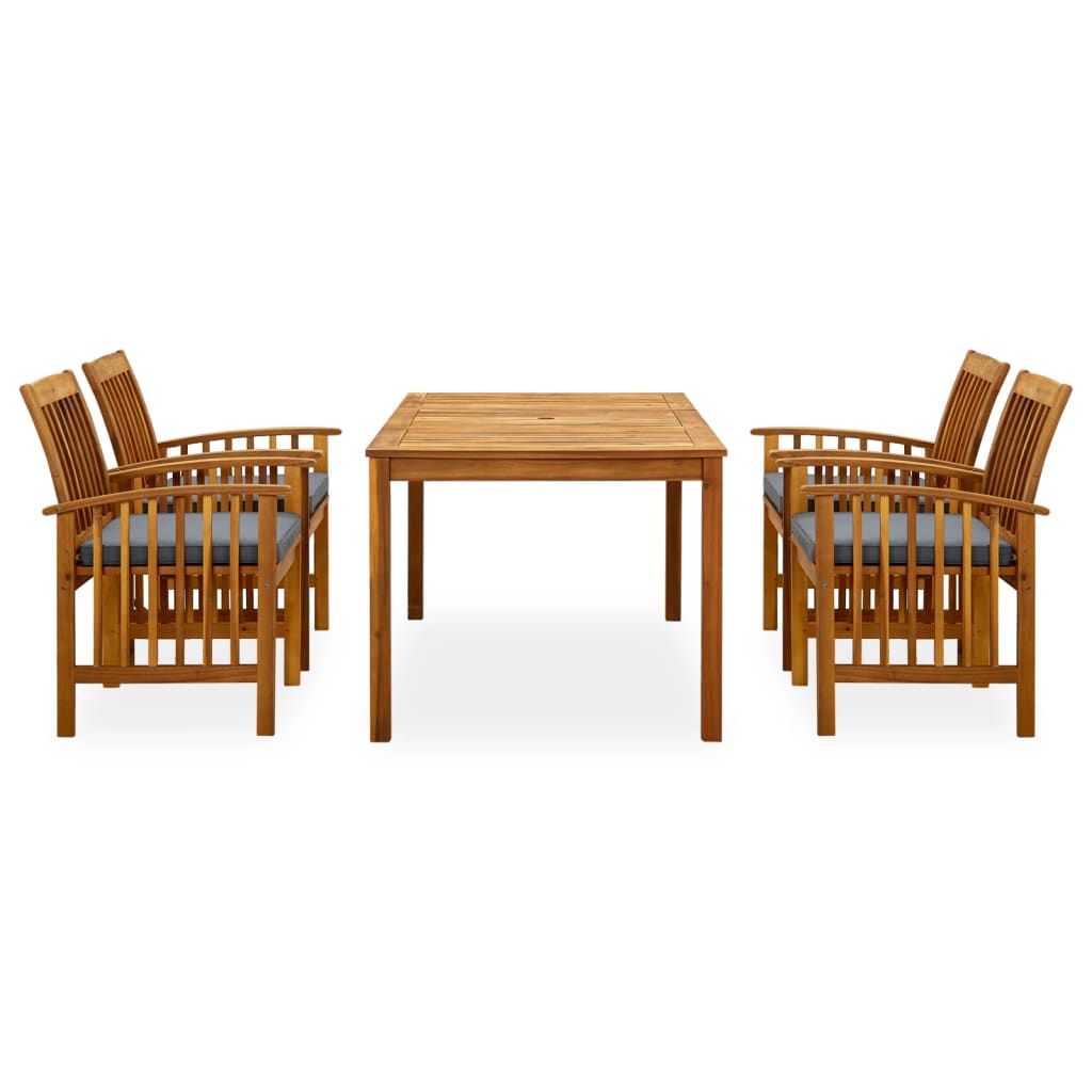Opis produktu: Stwórz fascynującą i spójną estetykę w swojej przestrzeni na świeżym powietrzu dzięki naszemu zestawowi jadalnianemu do ogrodu! Stół jadalniany wykonany jest z litego drewna akacjowego, twardego drewna o gęstych słojach, co czyni go solidnym, trwałym i łatwym w utrzymaniu. Drewniany blat może służyć do umieszczania potraw, napojów i innych przedmiotów. Krzesła stołowe charakteryzują się drewnianą ramą wykończoną olejem przez co nadają klasyczny wygląd Twojemu patio lub ogródkowi, jednocześnie wprowadzając do przestrzeni zewnętrznej naturalny charakter. Grubo wyściełane poduszki oferują również dodatkowy komfort siedzenia podczas odpoczynku. Co więcej zestaw ten jest łatwy do czyszczenia wilgotną ściereczką. Uwaga: aby przedłużyć żywotność mebli ogrodowych, zalecamy zabezpieczenie ich wodoodpornym pokrowcem.
