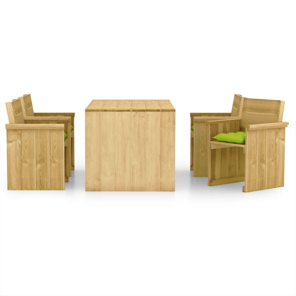 Stwórz fascynującą i spójną estetykę w swojej przestrzeni na świeżym powietrzu dzięki naszemu zestawowi jadalnianemu do ogrodu! Stół i krzesła prezentują elegancki i ponadczasowy design i zostały wykonane z impregnowanego drewna sosnowego, które jest trwałe, odporne na czynniki pogodowe i przyjazne dla środowiska. Możesz umieścić ten zestaw w ogrodzie lub na patio, aby móc w przyjemnym otoczeniu czytać książki i wypić kawę. Poduszki wykonano ze 100% poliestru, dzięki czemu są mocne i trwałe. Sprawdzą się również zarówno wewnątrz, jak i na zewnątrz pomieszczeń, oferując miękkie i wytrzymałe siedzisko. Dobrej jakości przeszycia na krawędziach zapewniają lata użytkowania. Ponadto poduszki mają sznurki, które umożliwiają ich łatwe przymocowanie do siedzisk. Uwaga: aby przedłużyć żywotność mebli ogrodowych, zalecamy zabezpieczenie ich wodoodpornym pokrowcem.