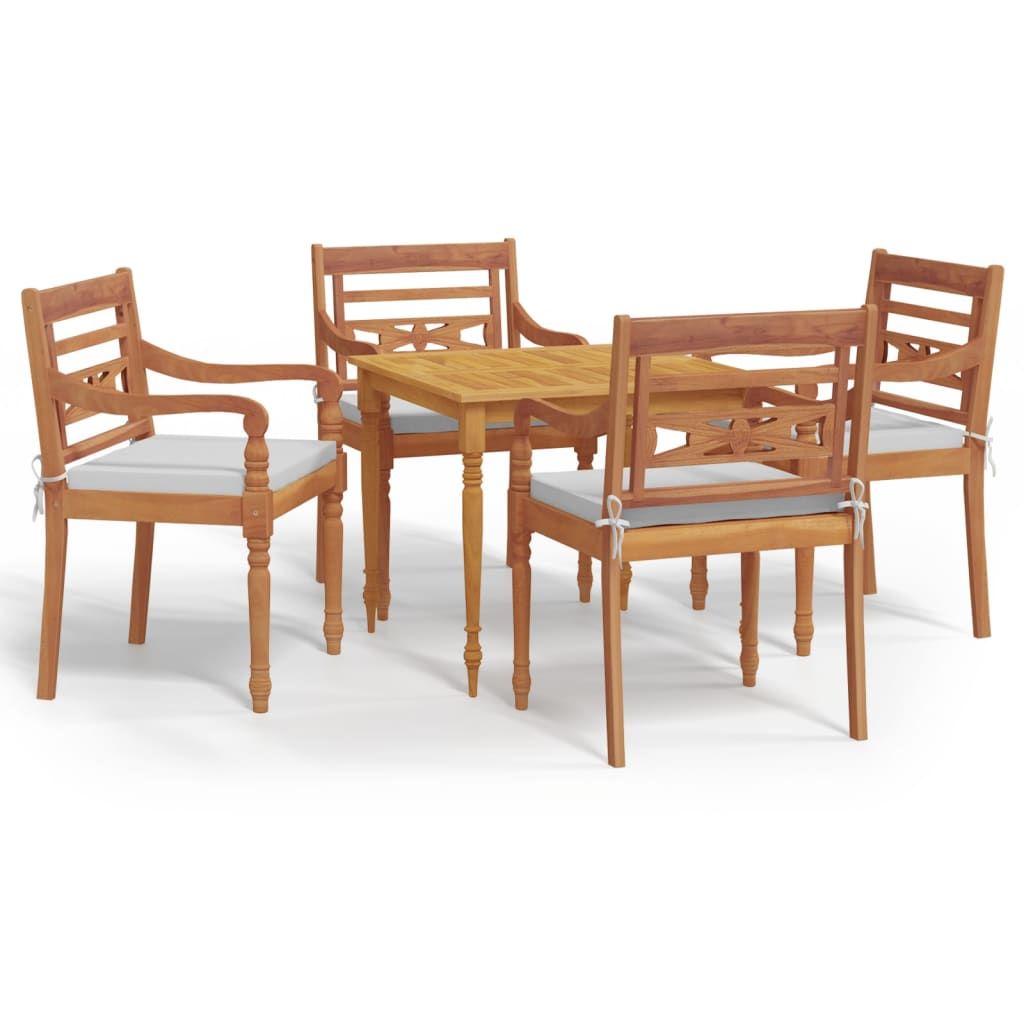 Drewniany zestaw mebli ogrodowych z poduszkami wniesie odrobinę stylu vintage do Twojego ogrodu, patio lub innej przestrzeni na świeżym powietrzu. Trwały materiał: lite drewno tekowe to piękny, naturalny materiał. Drewno było sezonowane, suszone komorowo, a następnie zostało wyszlifowane, aby nadać mu bardzo gładką powierzchnię. Drewno tekowe słynie z wyjątkowej wytrzymałości i odporności na czynniki pogodowe.Stabilna rama: drewniane ramy kompletu zapewniają jego solidność i stabilność.Praktyczny stół: stół oferuje dość miejsca na posiłki, napoje i przedmioty dekoracyjne.Komfort siedzenia: dzięki grubo wyściełanym poduszkom na siedziska meble są bardzo wygodne. Warto wiedzieć:Aby maksymalnie ułatwić montaż, każdy produkt jest dostarczany z instrukcją obsługi. Uwaga:Aby utrzymać meble ogrodowe w dobrej kondycji, zalecamy zabezpieczenie ich wodoodpornym pokrowcem.