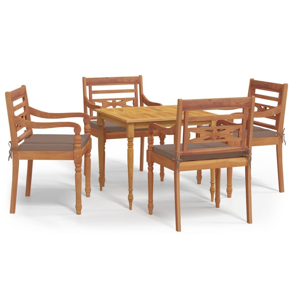 Opis produktu: Drewniany zestaw mebli ogrodowych z poduszkami wniesie odrobinę stylu vintage do Twojego ogrodu, patio lub innej przestrzeni na świeżym powietrzu. Trwały materiał: lite drewno tekowe to piękny, naturalny materiał. Drewno było sezonowane, suszone komorowo, a następnie zostało wyszlifowane, aby nadać mu bardzo gładką powierzchnię. Drewno tekowe słynie z wyjątkowej wytrzymałości i odporności na czynniki pogodowe.Stabilna rama: drewniane ramy kompletu zapewniają jego solidność i stabilność.Praktyczny stół: stół oferuje dość miejsca na posiłki, napoje i przedmioty dekoracyjne.Komfort siedzenia: dzięki grubo wyściełanym poduszkom na siedziska meble są bardzo wygodne. Warto wiedzieć:Aby maksymalnie ułatwić montaż, każdy produkt jest dostarczany z instrukcją obsługi. Uwaga:Aby utrzymać meble ogrodowe w dobrej kondycji, zalecamy zabezpieczenie ich wodoodpornym pokrowcem.