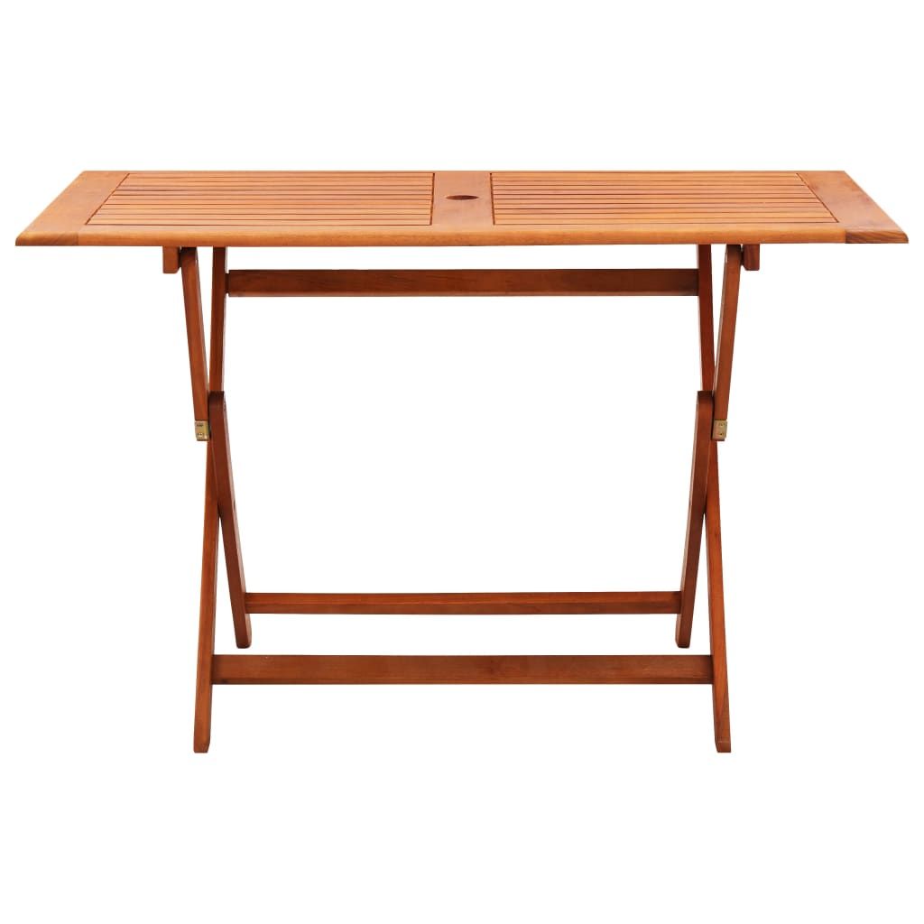 Opis produktu: Drewniany, składany zestaw mebli ogrodowych prezentuje rustykalny, ponadczasowy design i będzie znakomitym wyborem do spożywania posiłków w ogrodzie lub na patio. Zestaw ten wykonano z drewna eukaliptusowego, które jest odporne na czynniki atmosferyczne i trwałe na lata użytkowania. Olejowana powierzchnia jest łatwa do czyszczenia za pomocą wilgotnej ściereczki. Ponadto blat ma w środku otwór na parasol. Stół i krzesła można złożyć, aby zaoszczędzić miejsce, gdy nie są używane. Uwaga: aby przedłużyć żywotność mebli ogrodowych, zalecamy zabezpieczenie ich wodoodpornym pokrowcem.