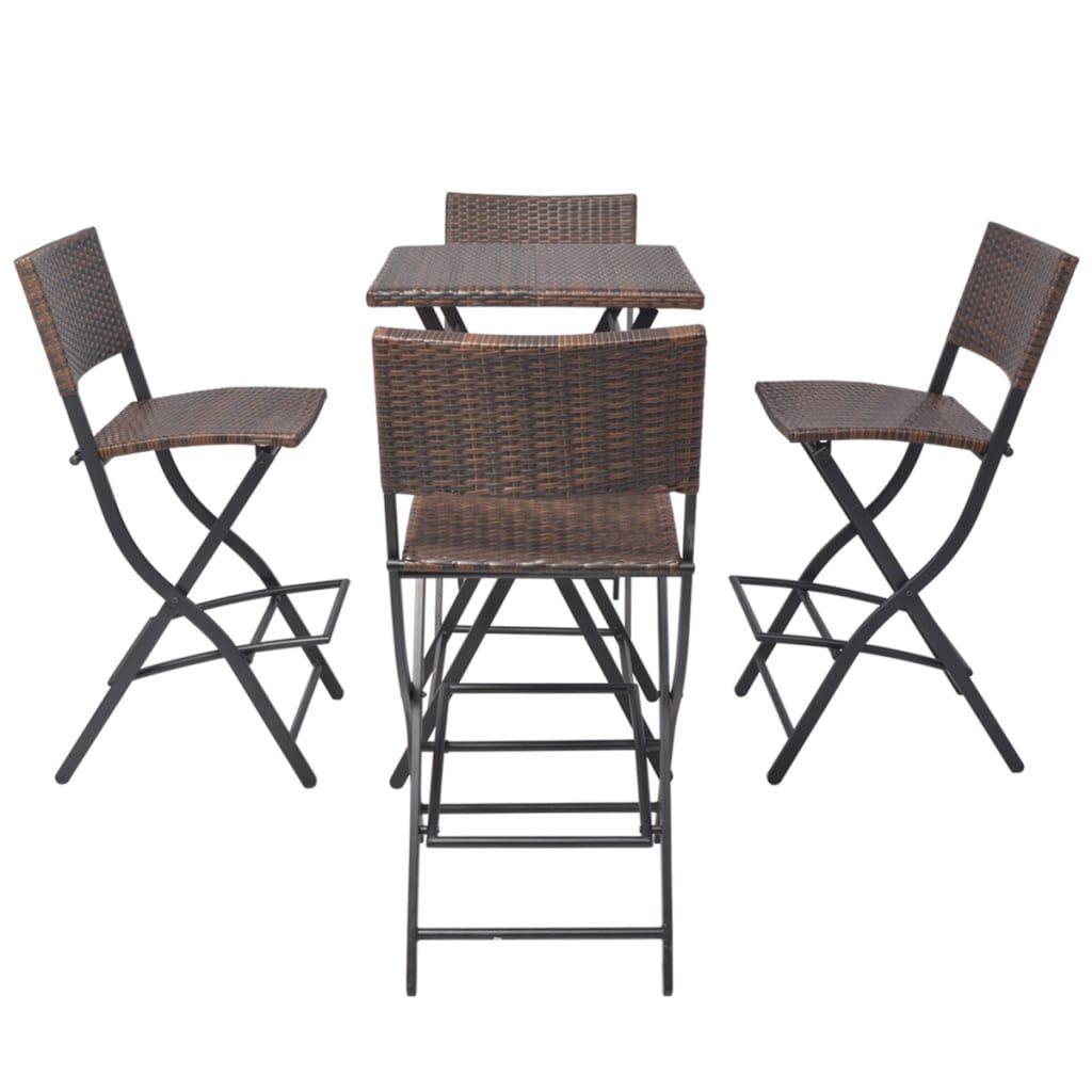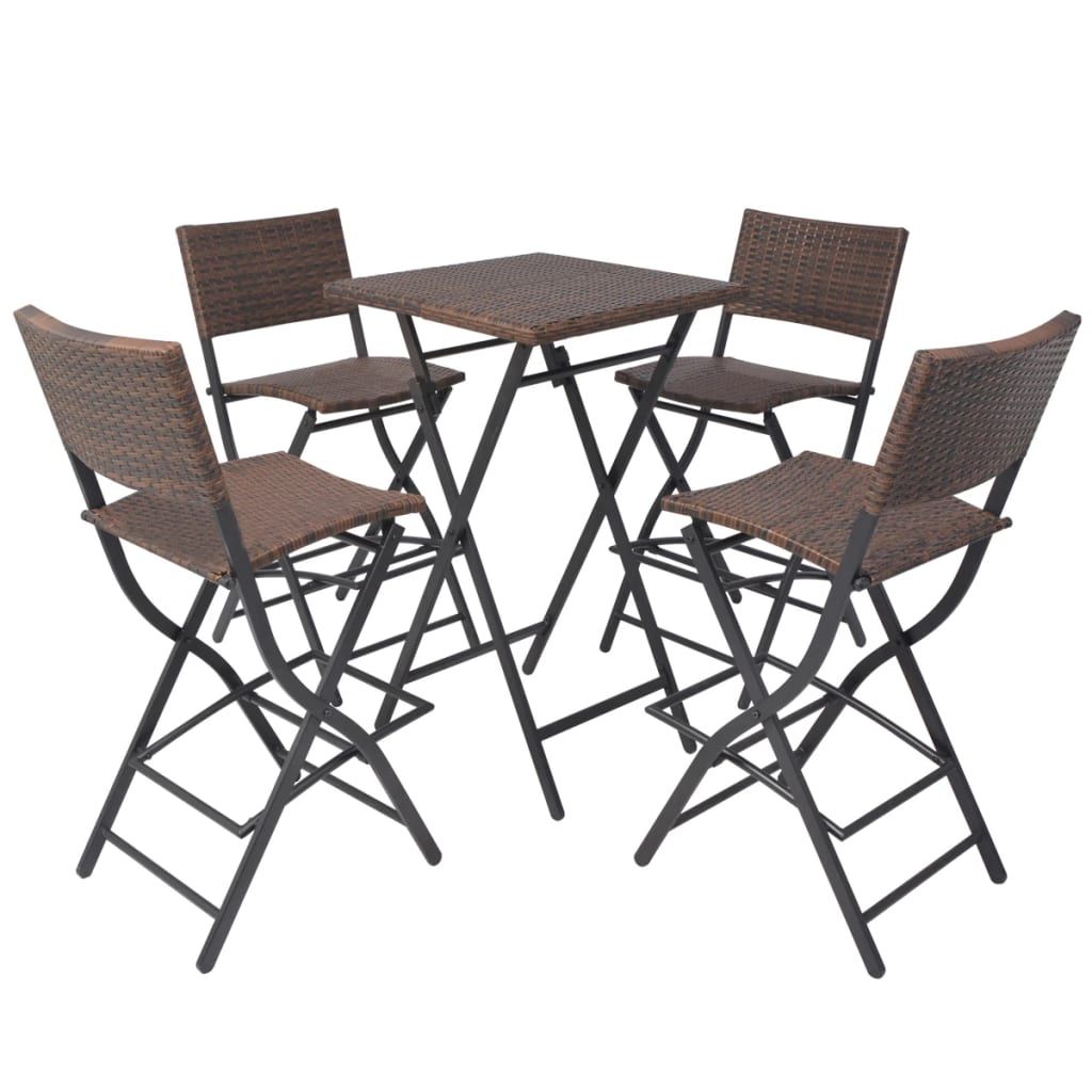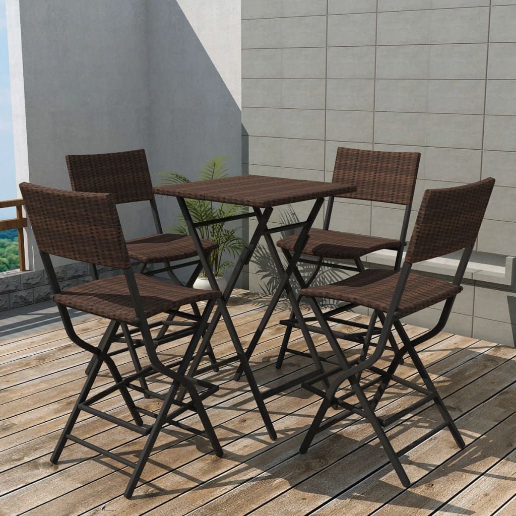 Zestaw barowy będzie świetnym dodatkiem do Twojego ogrodu czy patio. Sprawdzi się też idealnie jako zestaw do spożywania posiłków na świeżym powietrzu. Zestaw wykonany został z odpornego na warunki atmosferyczne, wodoodpornego polirattanu, dzięki czemu jest łatwy w czyszczeniu, wytrzymały i odpowiedni do codziennego użytku. Dzięki lekkiej konstrukcji jego elementy można z łatwością przestawiać. Stołki barowe posiadają podnóżki dla dodatkowego komfortu. Zarówno stół jak i krzesła są składane, dzięki czemu można zaoszczędzić miejsce podczas ich przechowywania. W skład przesyłki wchodzi 1 składany stolik barowy i 4 składane krzesła barowe. Montaż jest łatwy. Uwaga: zalecamy przykrycie mebli na czas deszczu, śniegu i mrozu.
