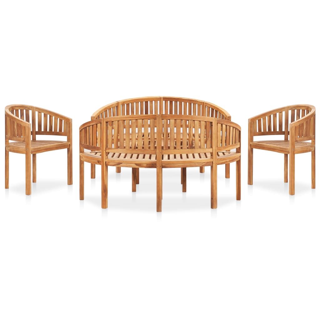Stwórz relaksującą strefę wypoczynku za sprawą tego modnego zestawu drewnianych mebli do ogrodu. Meble wykonano z niezwykle wytrzymałego drewna tekowego, które było sezonowane, suszone komorowo i drobno szlifowane, aby nadać mu bardzo gładki wygląd. Drewno tekowe słynie ze swojej wyjątkowej wytrzymałości i odporności na warunki atmosferyczne, dzięki czemu jest o wiele bardziej odpowiednie do produkcji mebli ogrodowych niż jakiekolwiek inny rodzaj drewna. Tek to idealny wybór, jeśli chcesz kupić trwały mebel ogrodowy. Stolik ogrodowy ma solidny blat o konstrukcji listwowej. Co więcej zaokrąglona forma krzeseł i ławki nadaje zestawowi wyjątkowy urok.