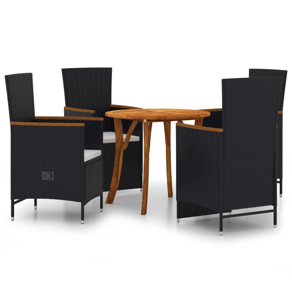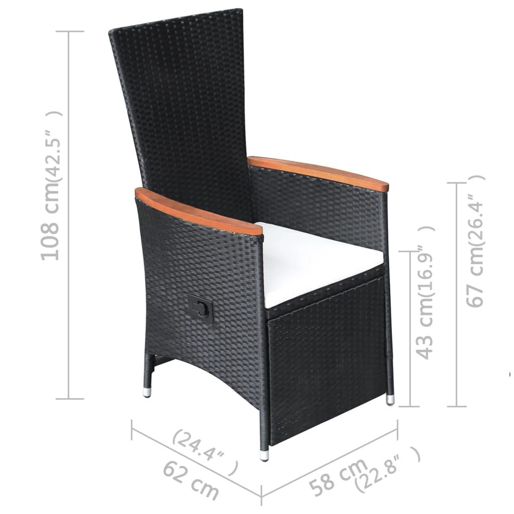 Opis produktu: Stwórz fascynującą i spójną estetykę w swojej przestrzeni na świeżym powietrzu dzięki naszemu zestawowi jadalnianemu do ogrodu! Stół ogrodowy wykonano z litego drewna akacjowego, dzięki czemu jest mocny i stabilny. Wykończona olejem powierzchnia ułatwia jego czyszczenie przy użyciu wilgotnej ściereczki. Ponadto wygięte nogi nadają mu stylowy wygląd. Krzesła stołowe ze stalową ramą pokrytą odpornym na czynniki pogodowe rattanem PE są mocne i łatwe do czyszczenia. Każde siedzisko zawiera grubo wypełnioną poduszkę dla większego komfortu podczas wypoczynku. Poprzez pociągnięcie przycisku z boku można rozłożyć oparcie i podnóżek. Uwaga: aby przedłużyć żywotność mebli ogrodowych, zalecamy zabezpieczenie ich wodoodpornym pokrowcem.