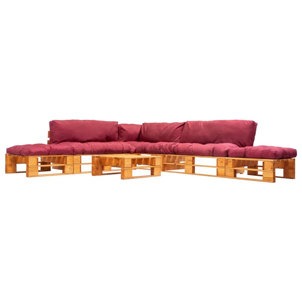 6-cz. zestaw ogrodowy, czerwone poduszki, palety z drewna