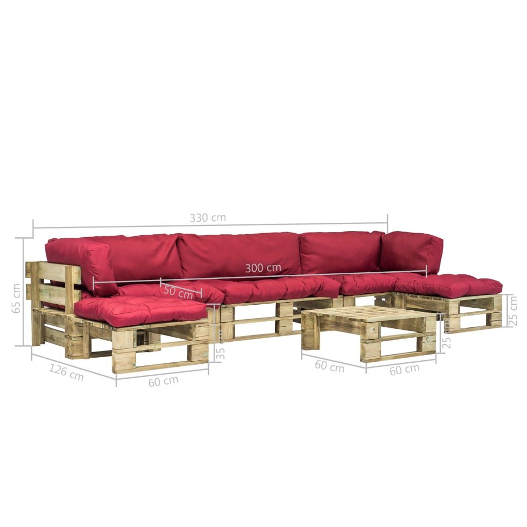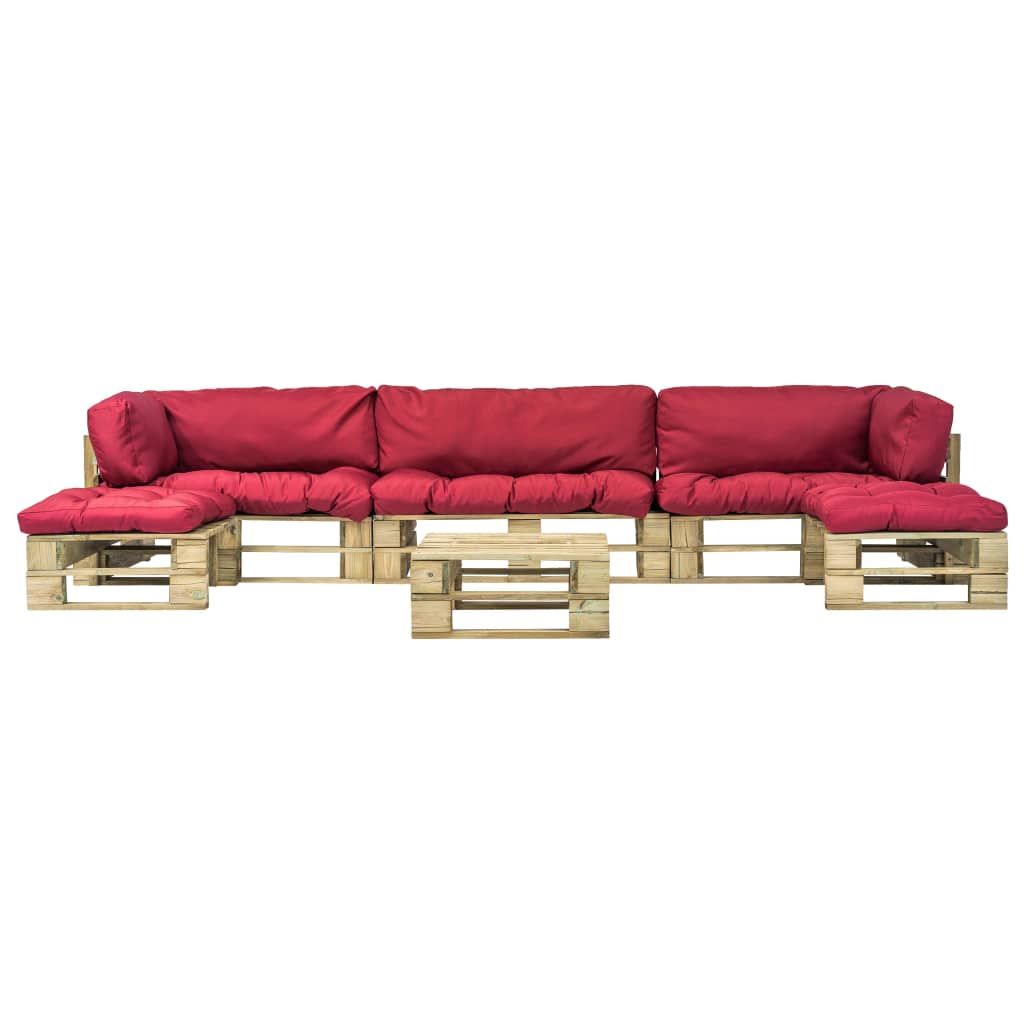 6-cz. zestaw ogrodowy, czerwone poduszki, palety z drewna