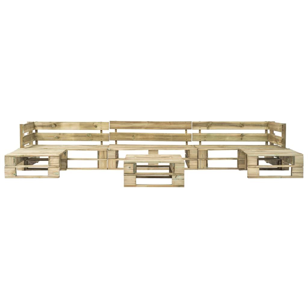 Nasz ogrodowy zestaw wypoczynkowy z palet będzie idealnym wyborem do relaksu i korzystania z pięknej pogody lub drzemki na świeżym powietrzu czy pogawędek z rodziną lub przyjaciółmi. Dzięki ponadczasowej konstrukcji z palet komplet ten wniesie odrobinę rustykalnego uroku na Twoje patio, do ogrodu lub salonu. Wykonany z impregnowanego drewna sosnowego zestaw wypoczynkowy do ogrodu jest trwały, odporny na czynniki pogodowe i przyjazny dla środowiska. Charakteryzuje się solidną konstrukcją i łatwością w utrzymaniu. Zestaw jest dostarczany wraz z grubo wypełnionymi poduszkami, dzięki czemu oferuje najwyższy komfort. Stolik kawowy jest idealny do postawienia przekąsek i napojów w zasięgu ręki. Dostawa obejmuje 2 sofy dwuosobowe, środkową sofę dwuosobową, 2 stołki (pufy), stolik kawowy oraz zdejmowane poduszki na siedziska i oparcia. Montaż mebli jest łatwy. Prosimy mieć na uwadze, że drewno to materiał naturalny i może wykazywać pewne niedoskonałości.