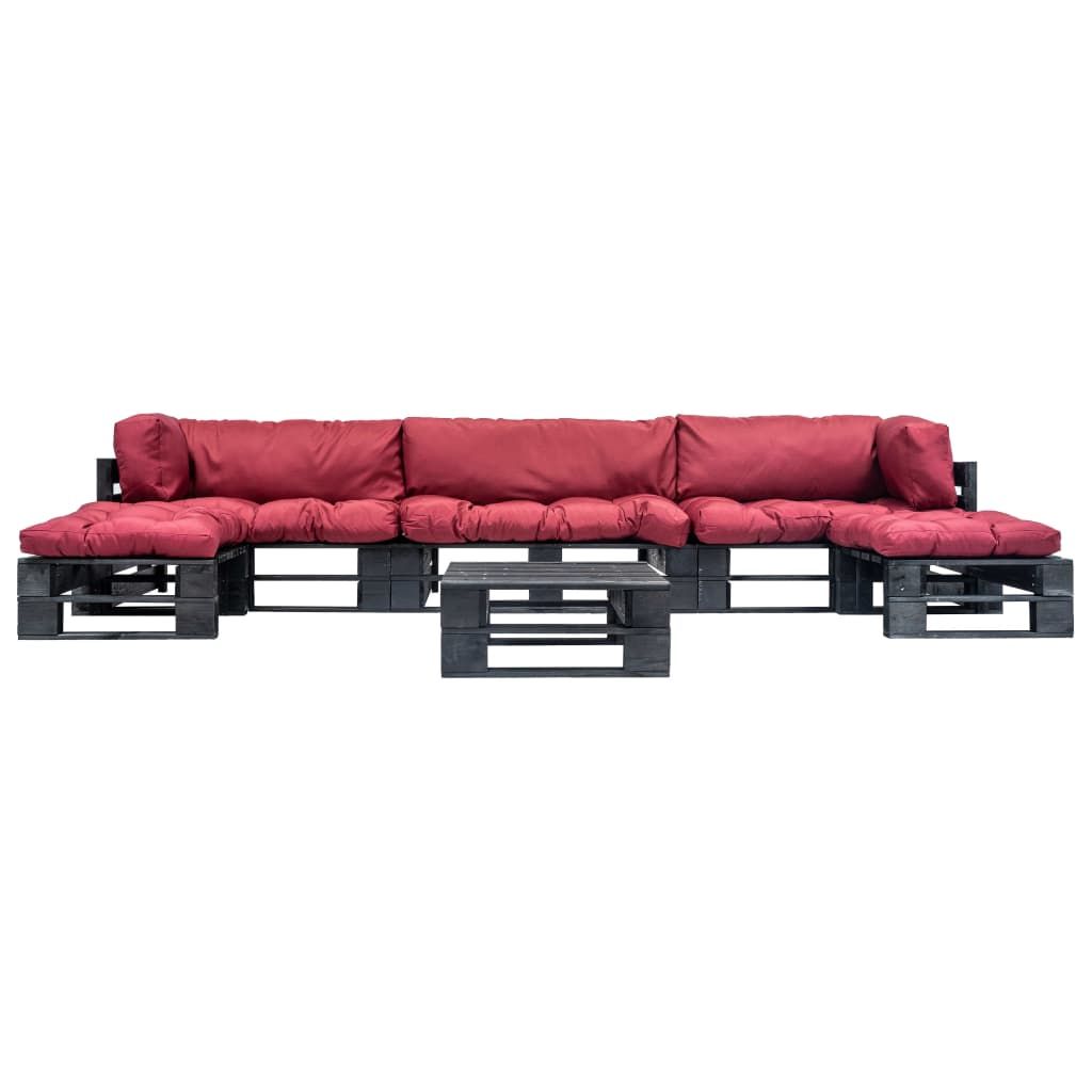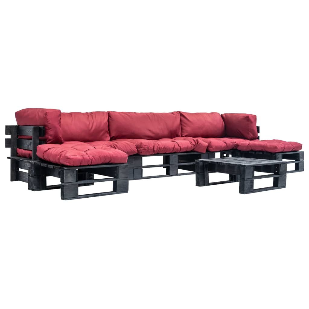 6-cz. zestaw ogrodowy, czerwone poduszki, palety z drewna