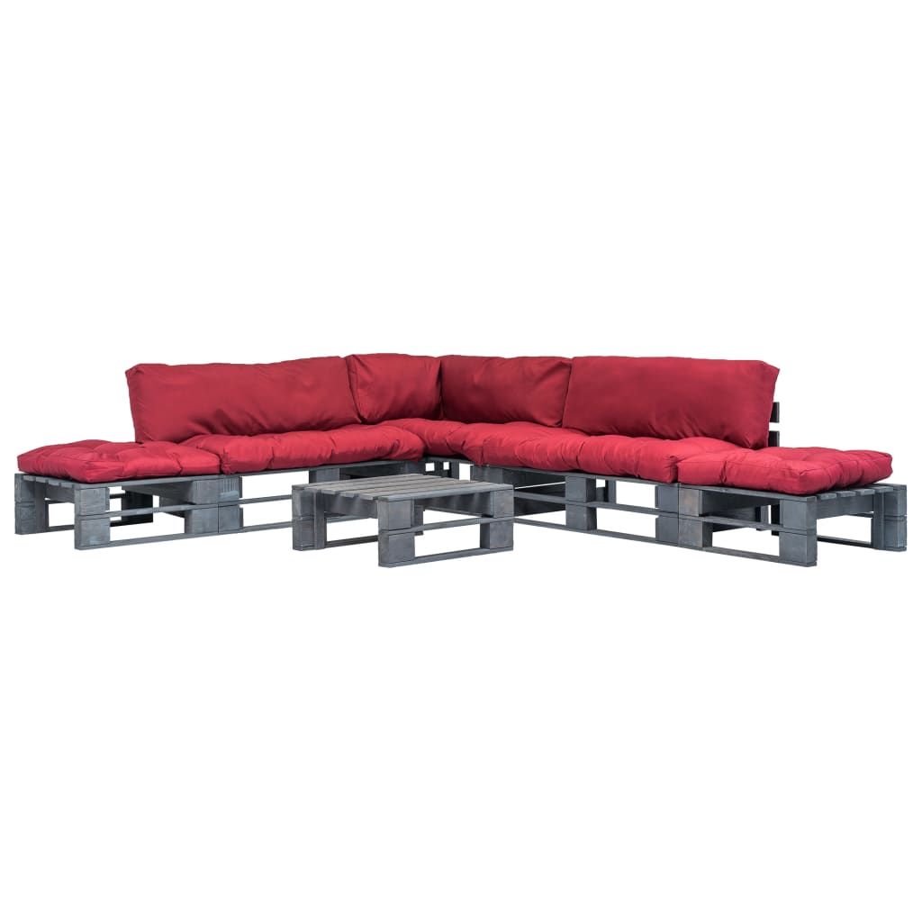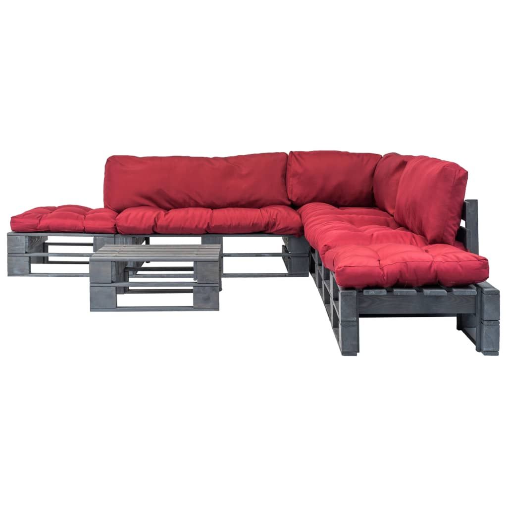 6-cz. zestaw ogrodowy, czerwone poduszki, palety z drewna