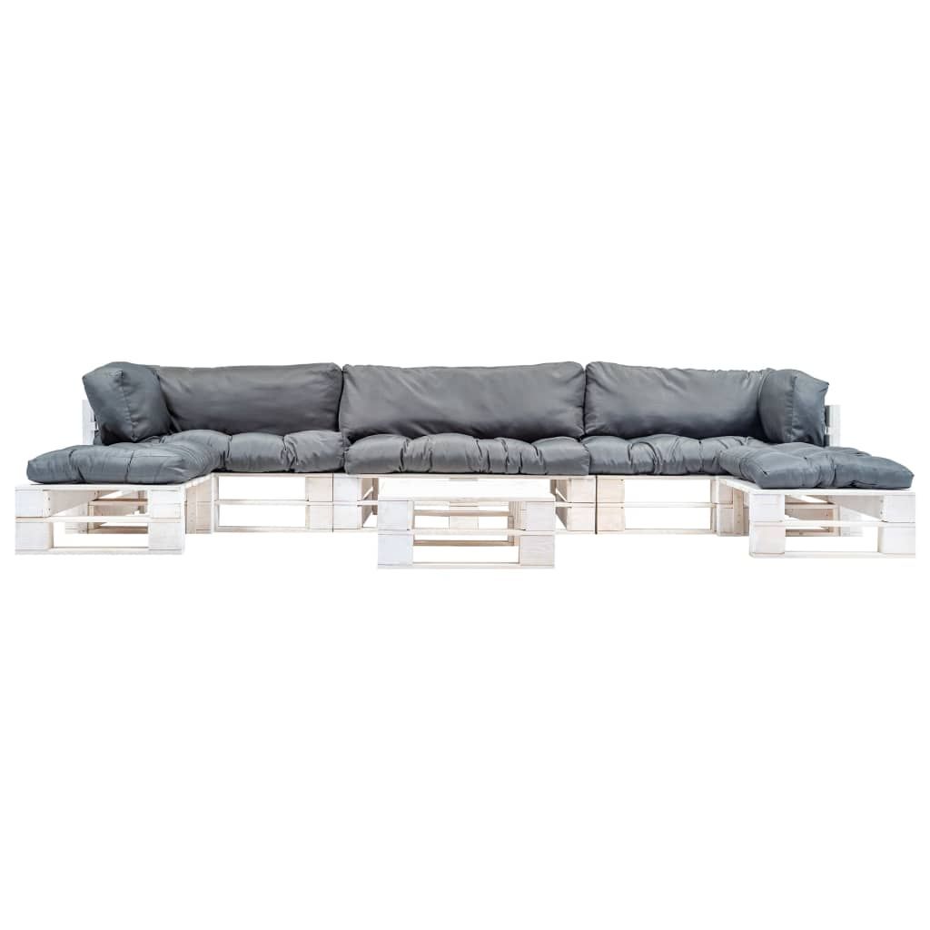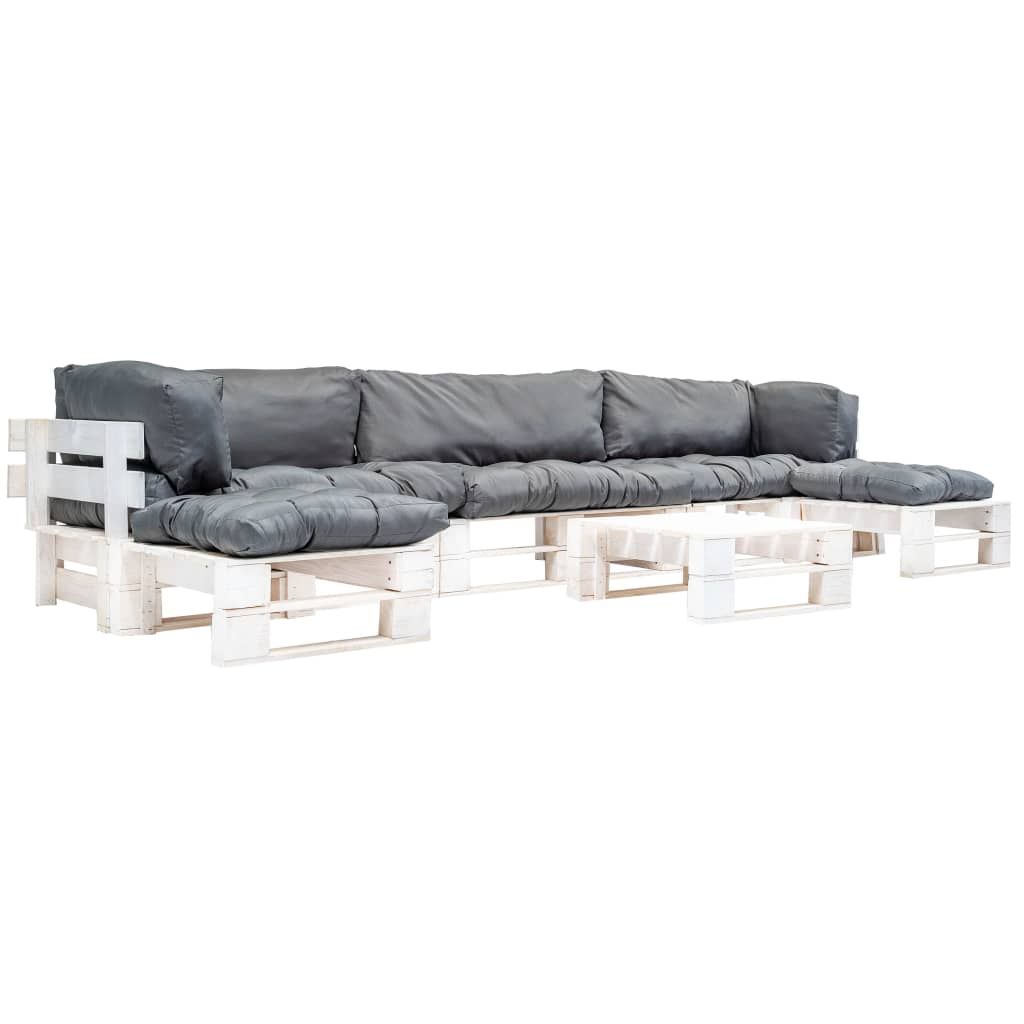 6-cz. zestaw ogrodowy, szare poduszki, palety z drewna