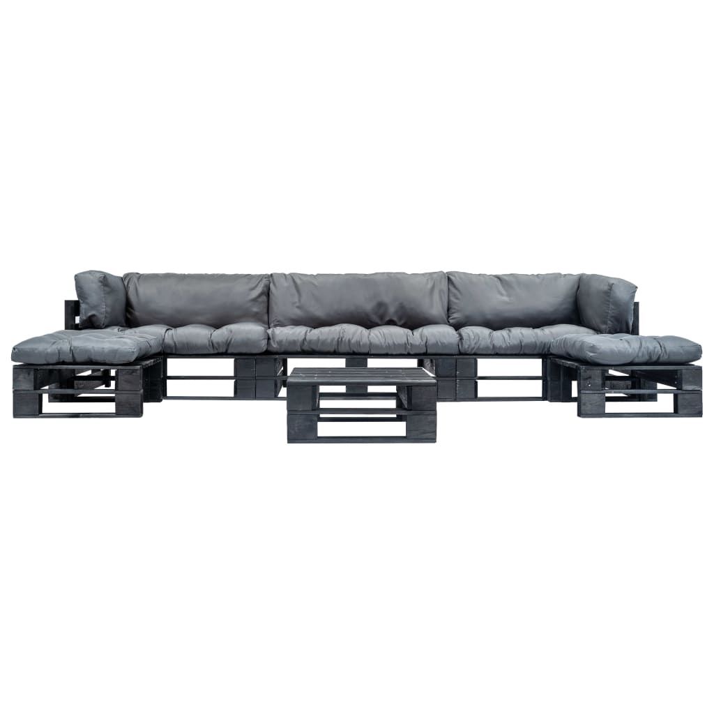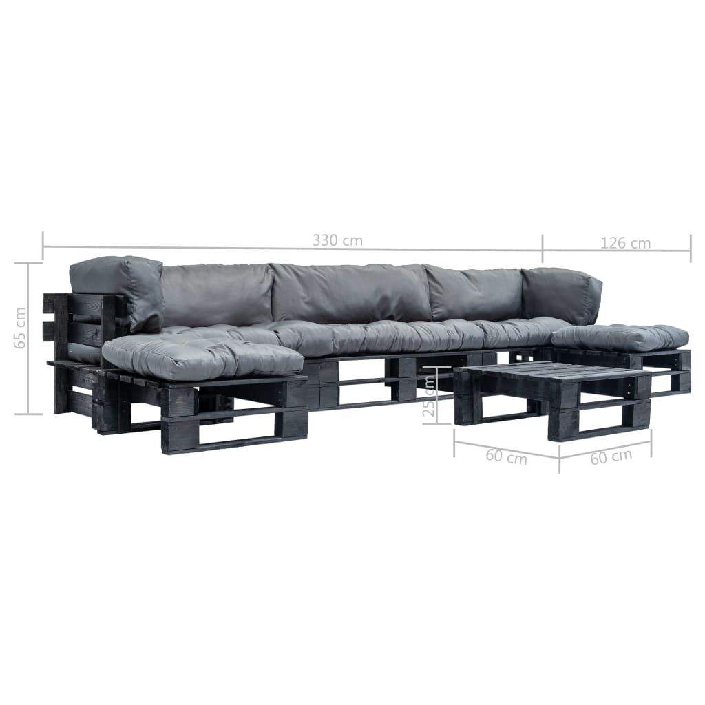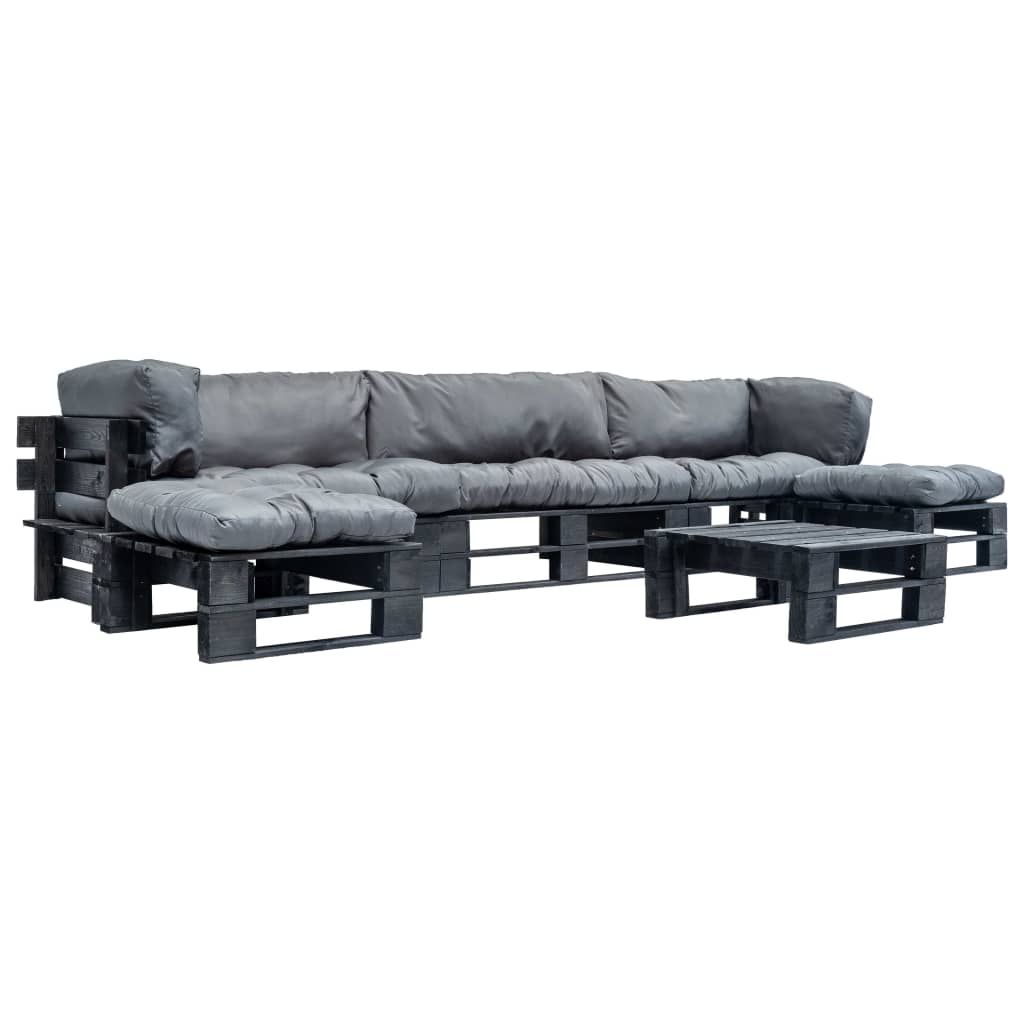 6-cz. zestaw ogrodowy, szare poduszki, palety z drewna