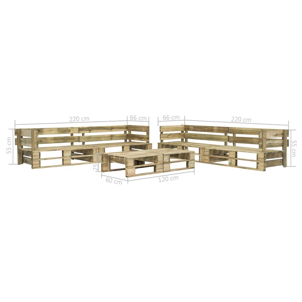 Opis produktu: Nasz ogrodowy zestaw wypoczynkowy z palet będzie idealnym wyborem, aby się zrelaksować i skorzystać ze świeżego powietrza, uciąć sobie drzemkę czy pogawędzić z rodziną lub przyjaciółmi. Dzięki ponadczasowej konstrukcji z palet komplet ten wniesie odrobinę rustykalnego uroku na Twoje patio, do ogrodu lub salonu. Wykonany z impregnowanego drewna sosnowego zestaw wypoczynkowy do ogrodu jest trwały, odporny na czynniki pogodowe i przyjazny dla środowiska. Charakteryzuje się solidną konstrukcją i łatwością w utrzymaniu. W połączeniu z grubo wypełnionymi poduszkami (nie są one częścią zestawu) komplet oferuje najwyższy komfort. Stolik kawowy jest idealny do postawienia przekąsek i napojów w zasięgu ręki. Montaż mebli jest łatwy. Prosimy mieć na uwadze, że drewno to materiał naturalny i może wykazywać pewne niedoskonałości.