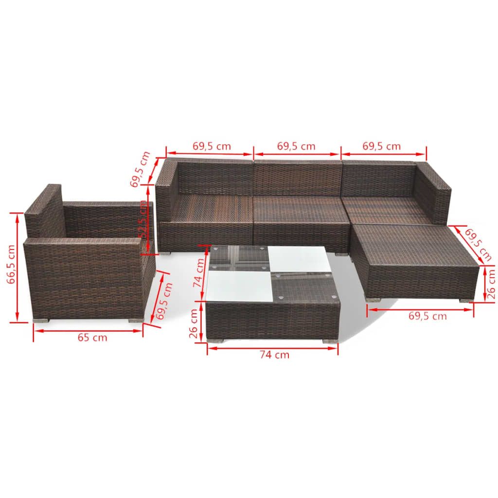 Opis produktu: Ten zestaw mebli do ogrodu będzie znakomitym dodatkiem do Twojej przestrzeni na zewnątrz. Wniesie odrobinę nowoczesnej elegancji do ogrodu lub tarasu dzięki prostej, a zarazem stylowej formie. Wykonany z odpornego na czynniki pogodowe i wodę rattanu PE zestaw jest łatwy w czyszczeniu, mocny i odpowiedni do codziennego użytku. Kryte proszkowo stalowe ramy sprawiają, że zestaw jest mocny i trwały. Dzięki lekkiej konstrukcji meble można łatwo przestawiać. Zestaw ten jest dostarczany z bardzo wygodnymi, grubo wyściełanymi poduszkami na siedziska i pod plecy. Poszewki na poduszki są zdejmowane i można je prać. W skład przesyłki wchodzą: 2 siedziska narożne, 1 sofa środkowa, 1 fotel, 1 stołek, 1 stolik kawowy i 11 poduszek. Uwaga: zalecamy przykrycie zestawu na czas deszczu, śniegu i mrozu.