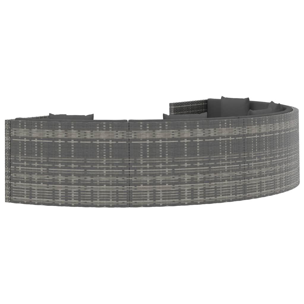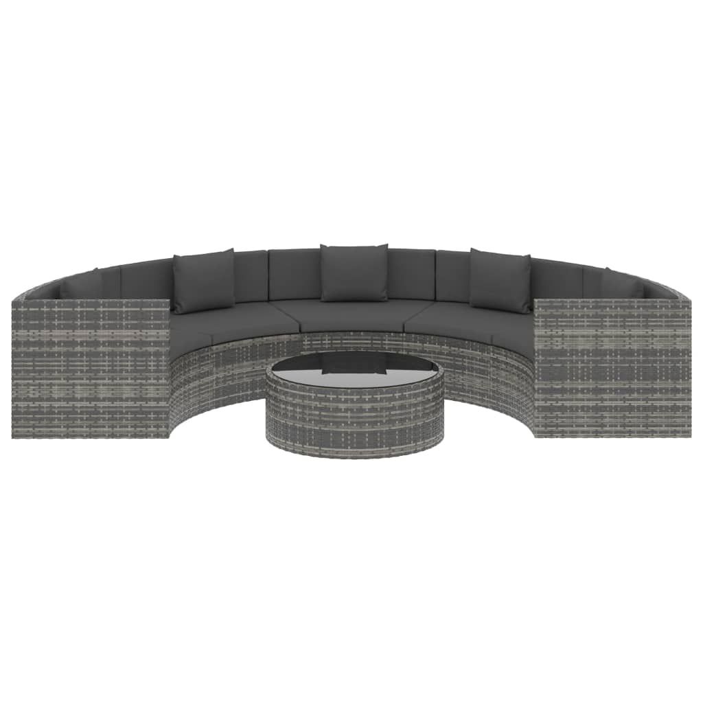 Opis produktu: Stylowy półokrągły zestaw mebli ogrodowych będzie przyciągał wzrok w Twoim ogrodzie, na podwórku lub na balkonie. Wykonany z rattanu PE zestaw ogrodowy przeznaczony jest do całorocznego użytkowania na zewnątrz. Rama ze stali malowanej proszkowo oferuje wyjątkową stabilność i zapewnia kompletowi wypoczynkowemu długą żywotność i doskonałą trwałość. Odporny na warunki atmosferyczne i wodoodporny rattan PE sprawia, że sofa jest łatwa w czyszczeniu. Grube, miękkie poduszki na siedzisko i oparcie, wykonane z wodoodpornego poliestru, niewątpliwie zapewnią najwyższy komfort siedzenia. Dodatkowo pokrowce są wyposażone w zamki błyskawiczne, które można zdejmować i prać. Zestaw mebli ogrodowych charakteryzuje się eleganckim designem, doskonałą estetyką i wysoką wytrzymałością. Uwaga: zalecamy przykrycie zestawu na czas deszczu, śniegu i mrozu.