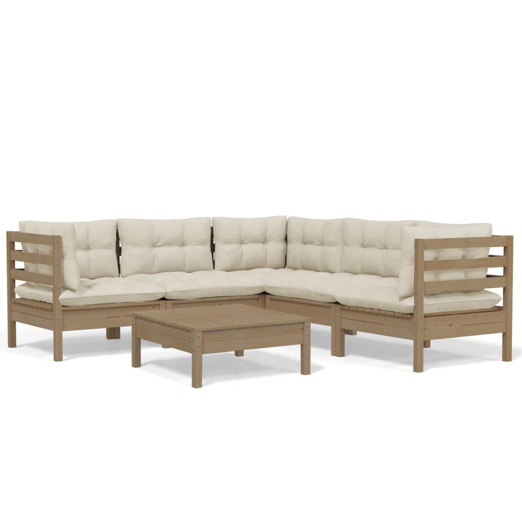 Opis produktu: Ten ogrodowy zestaw wypoczynkowy jest znakomitym wyborem na relaks i korzystanie z pogody, a także drzemkę czy rozmowę z rodziną lub przyjaciółmi. Zestaw wypoczynkowy do ogrodu wykonano z litego drewna sosnowego, dzięki czemu jest solidny i stabilny. Poduszki oferują większy komfort. Możesz zestawiać ten komplet z innymi modułami i tworzyć własne aranżacje mebli wypoczynkowych w ogrodzie! Uwaga: aby przedłużyć żywotność mebli ogrodowych, zalecamy zabezpieczenie ich wodoodpornym pokrowcem.